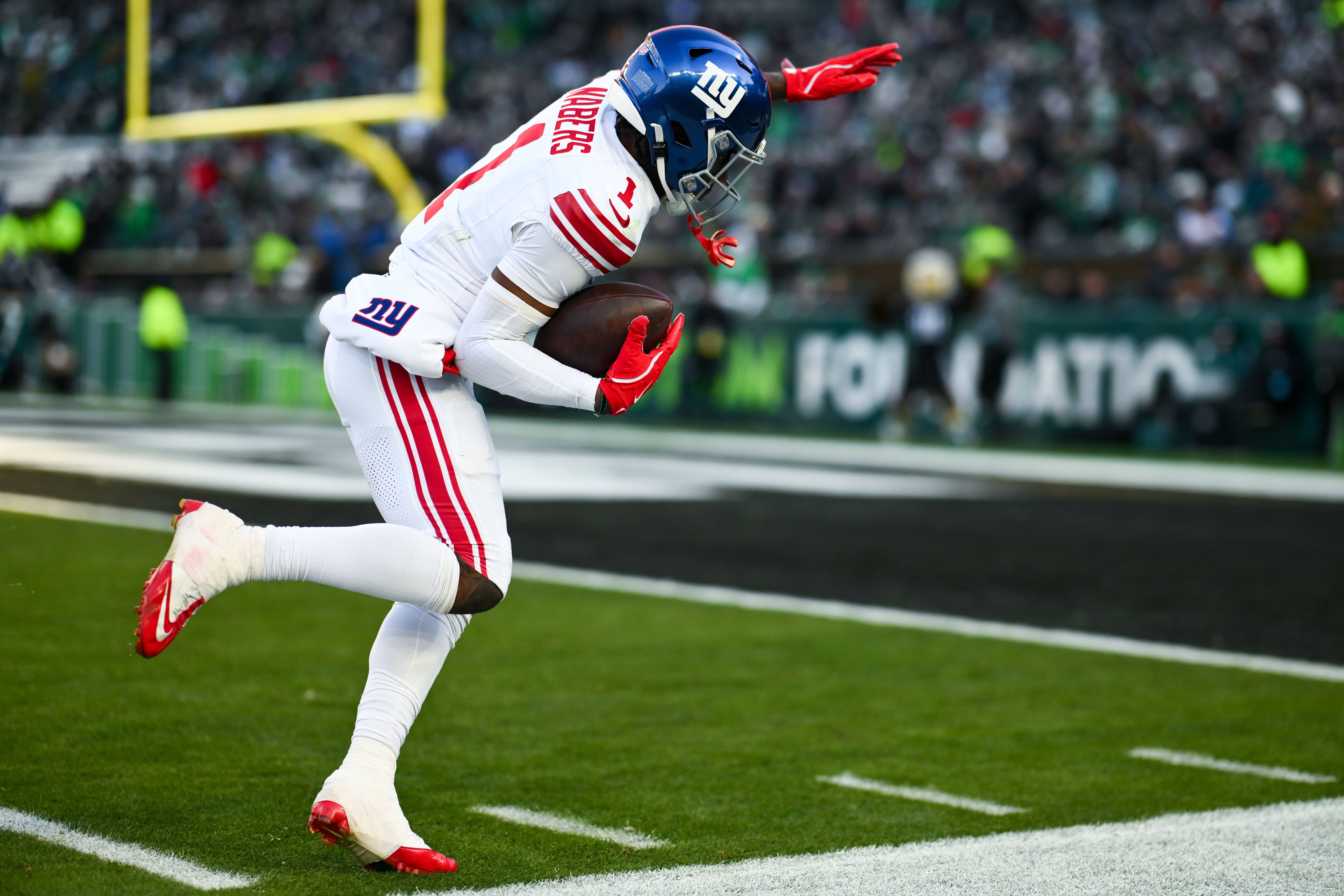 PHILADELPHIA, PA - JANUARY 05: New York Giants wide receiver Malik Nabers (1) carries the ball along the sideline to score a touchdown in the second half during the game between the New York Giants...