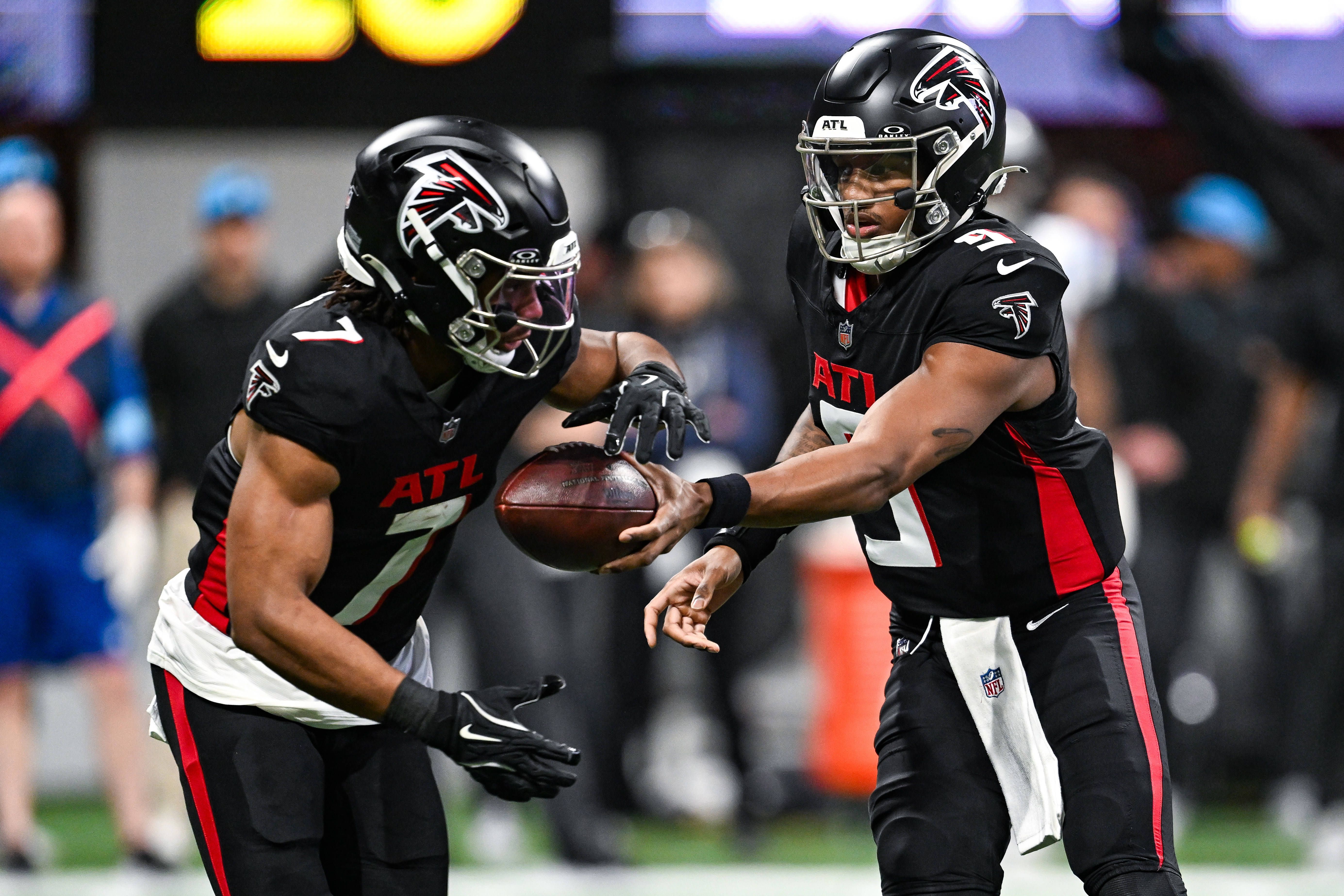 ATLANTA, GA Ð JANUARY 05: Atlanta quarterback Michael Penix Jr. (9) hands off to running back Bijan Robinson (7) during the NFL, American Football Herren, USA game between the Carolina Panthers and...