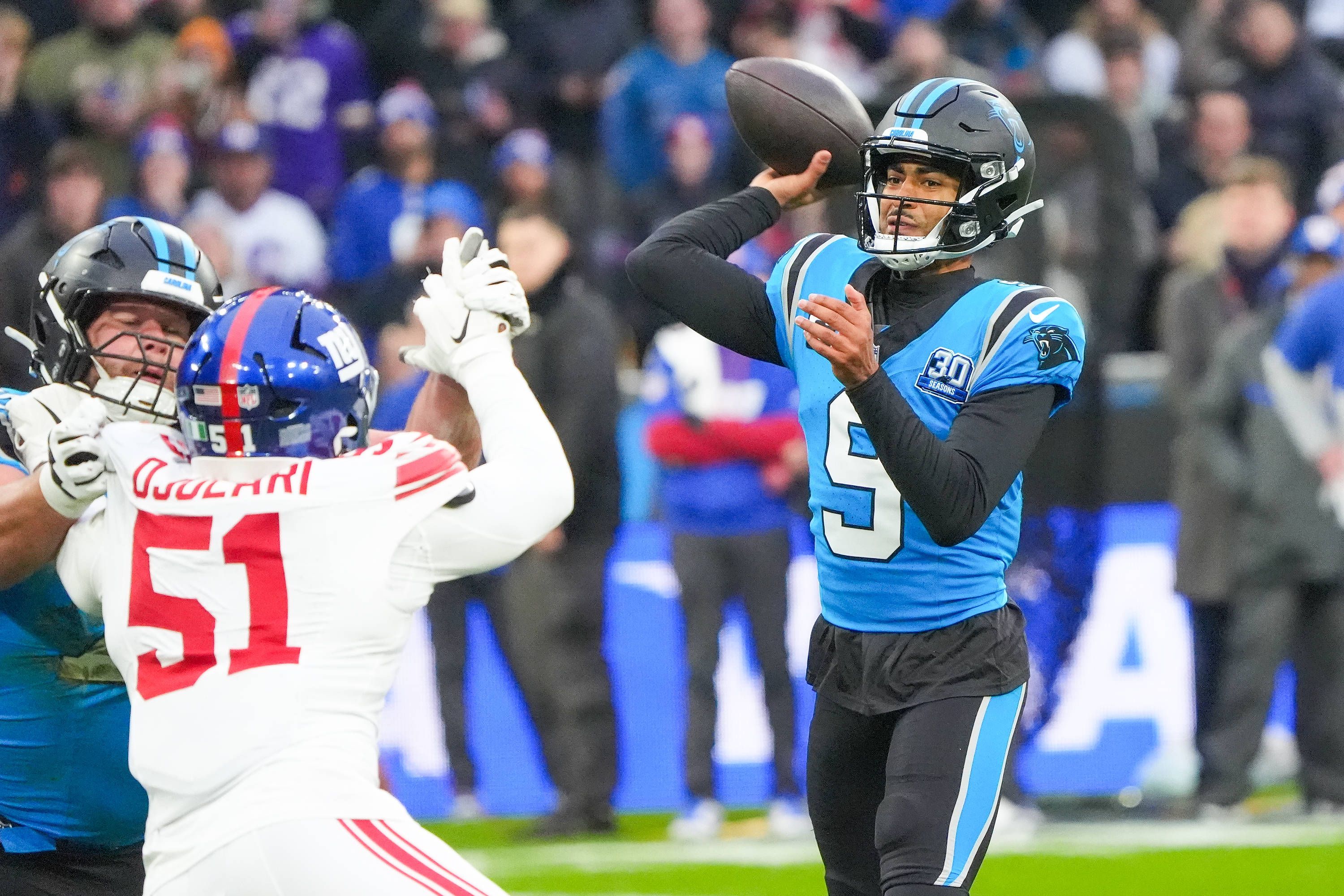 QB Bryce Young (Carolina Panthers, 9) wirft einen Pass gegen OLB Azeez Ojulari (New York Giants, 51) - München 10.11.2024: Carolina Panthers vs. New York Giants, Allianz Arena, NFL, American Footba...