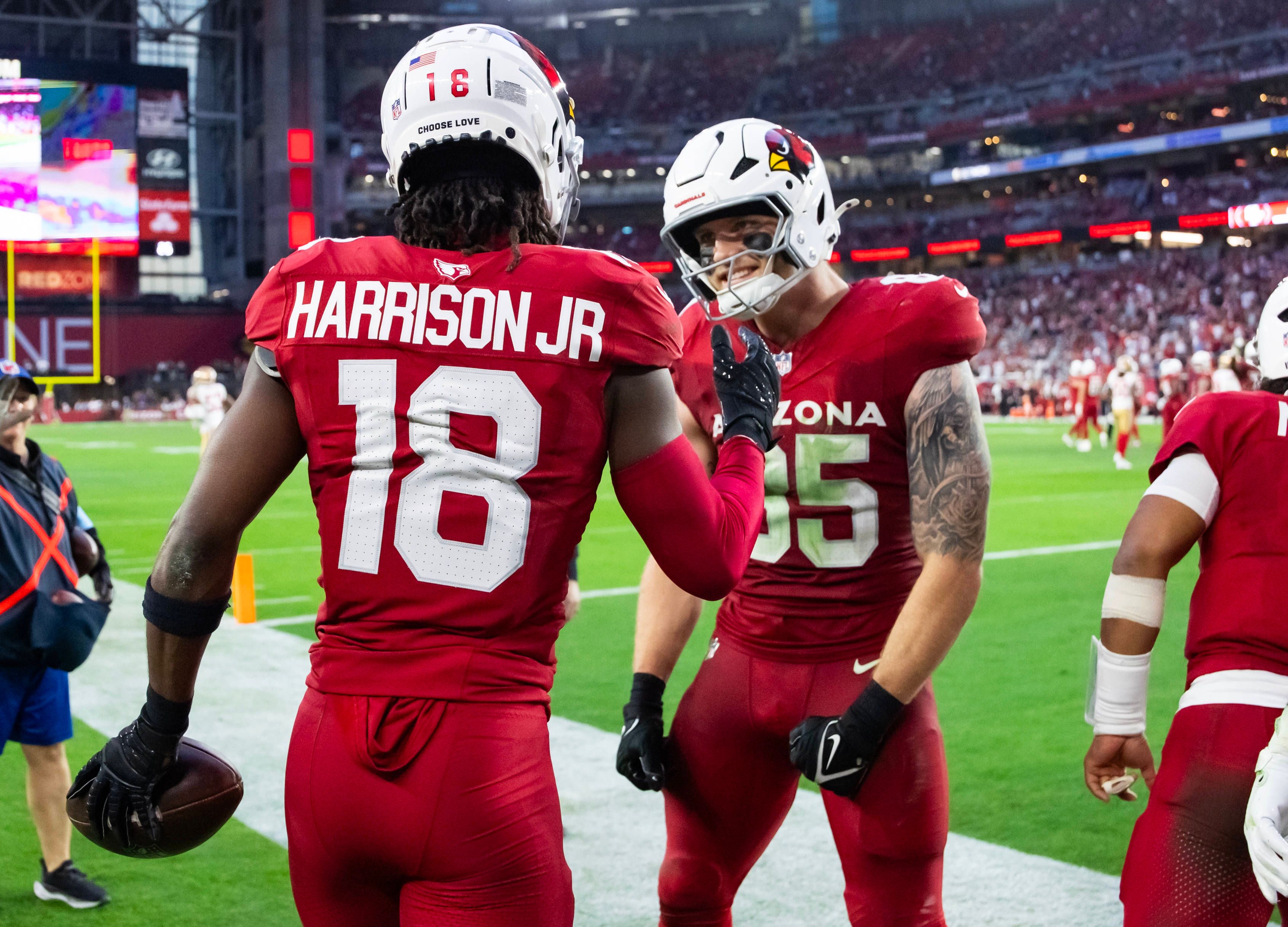 NFL, American Football Herren, USA San Francisco 49ers at Arizona Cardinals Jan 5, 2025; Glendale, Arizona, USA; Arizona Cardinals wide receiver Marvin Harrison Jr. (18) celebrates a touchdown with...