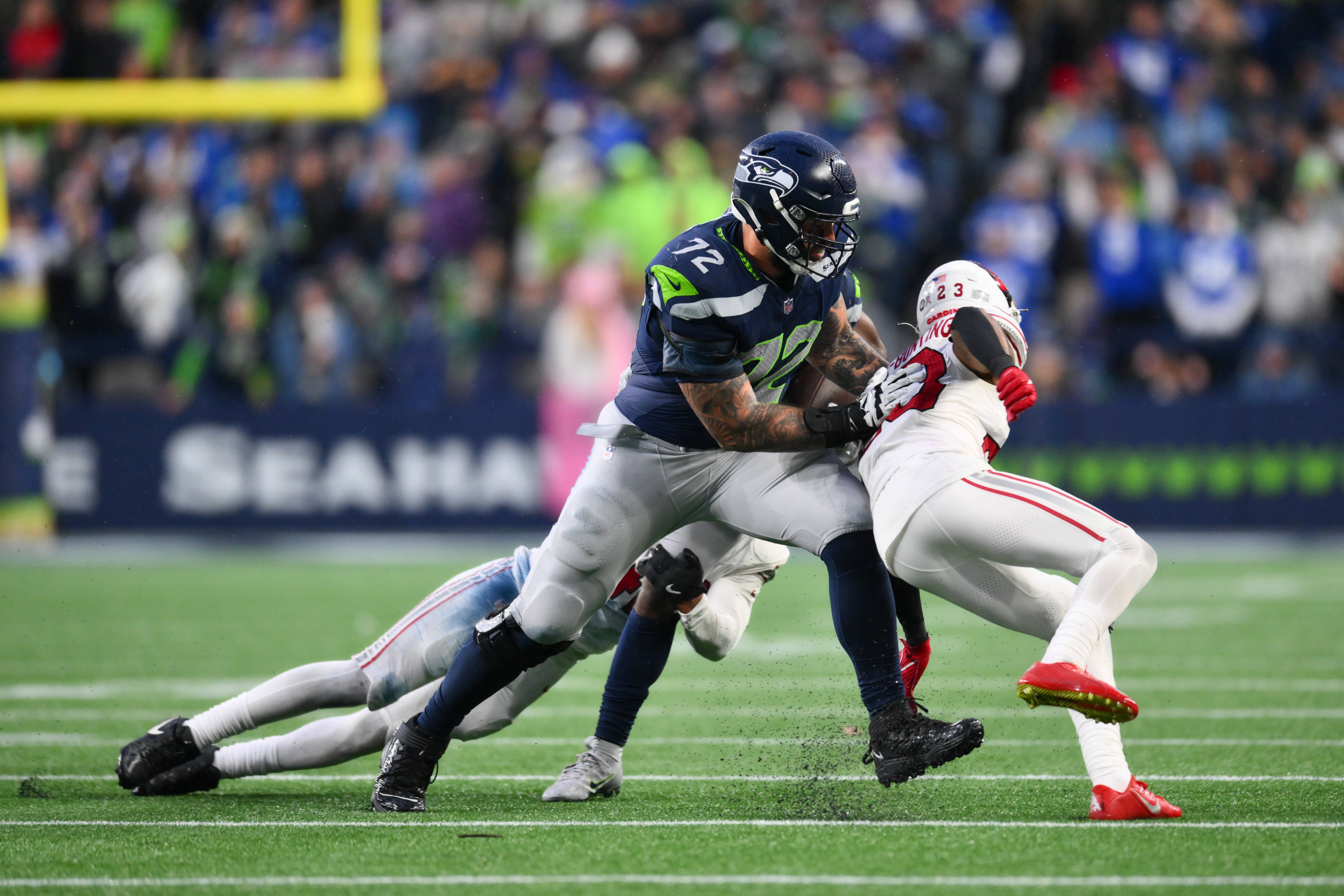 NFL, American Football Herren, USA Arizona Cardinals at Seattle Seahawks Nov 24, 2024; Seattle, Washington, USA; Seattle Seahawks offensive tackle Abraham Lucas (72) blocks Arizona Cardinals corner...