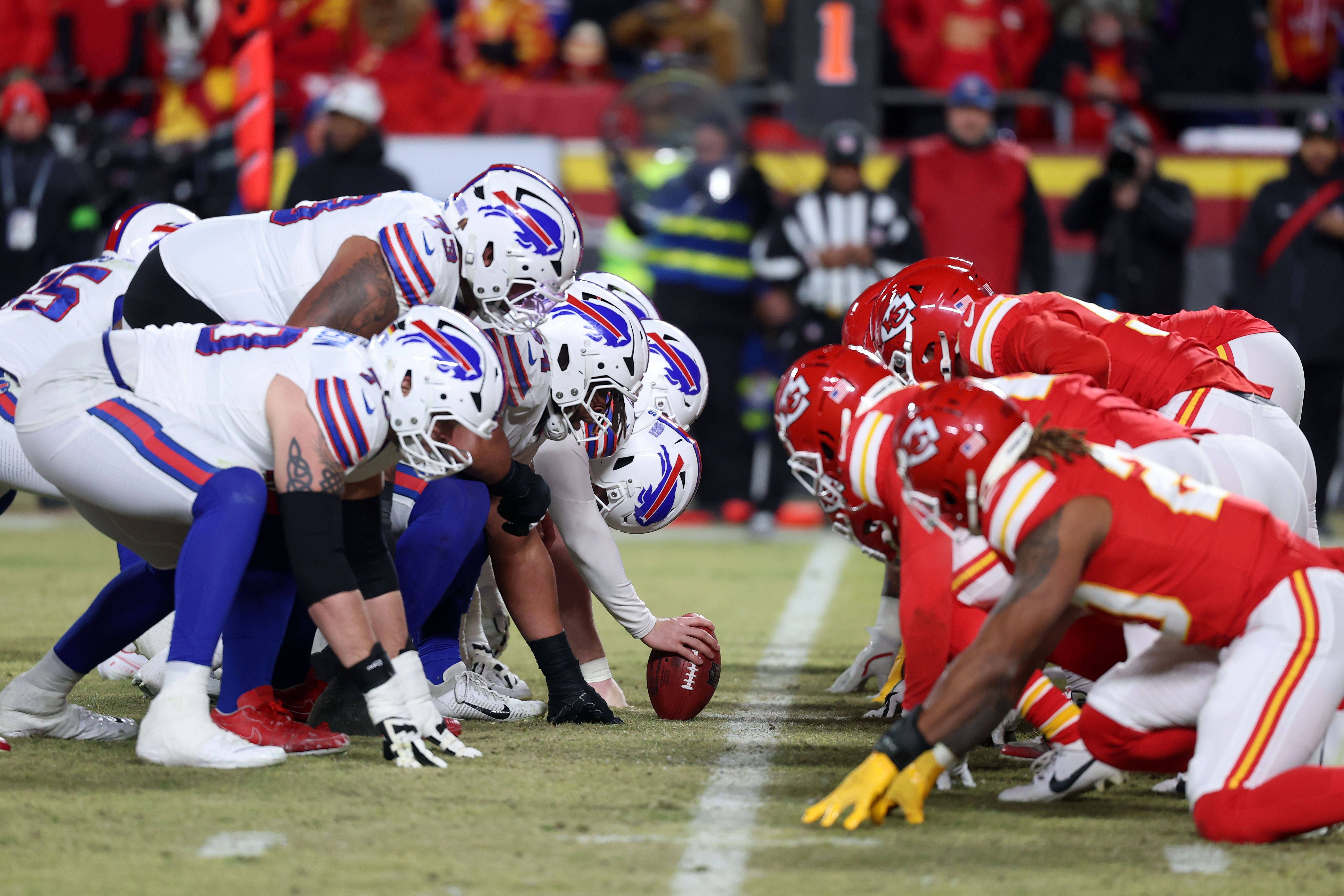 NFL, American Football Herren, USA AFC Championship-Buffalo Bills at Kansas City Chiefs Jan 26, 2025; Kansas City, MO, USA; The Buffalo Bills offensive linemen line up against the Kansas City Chief...