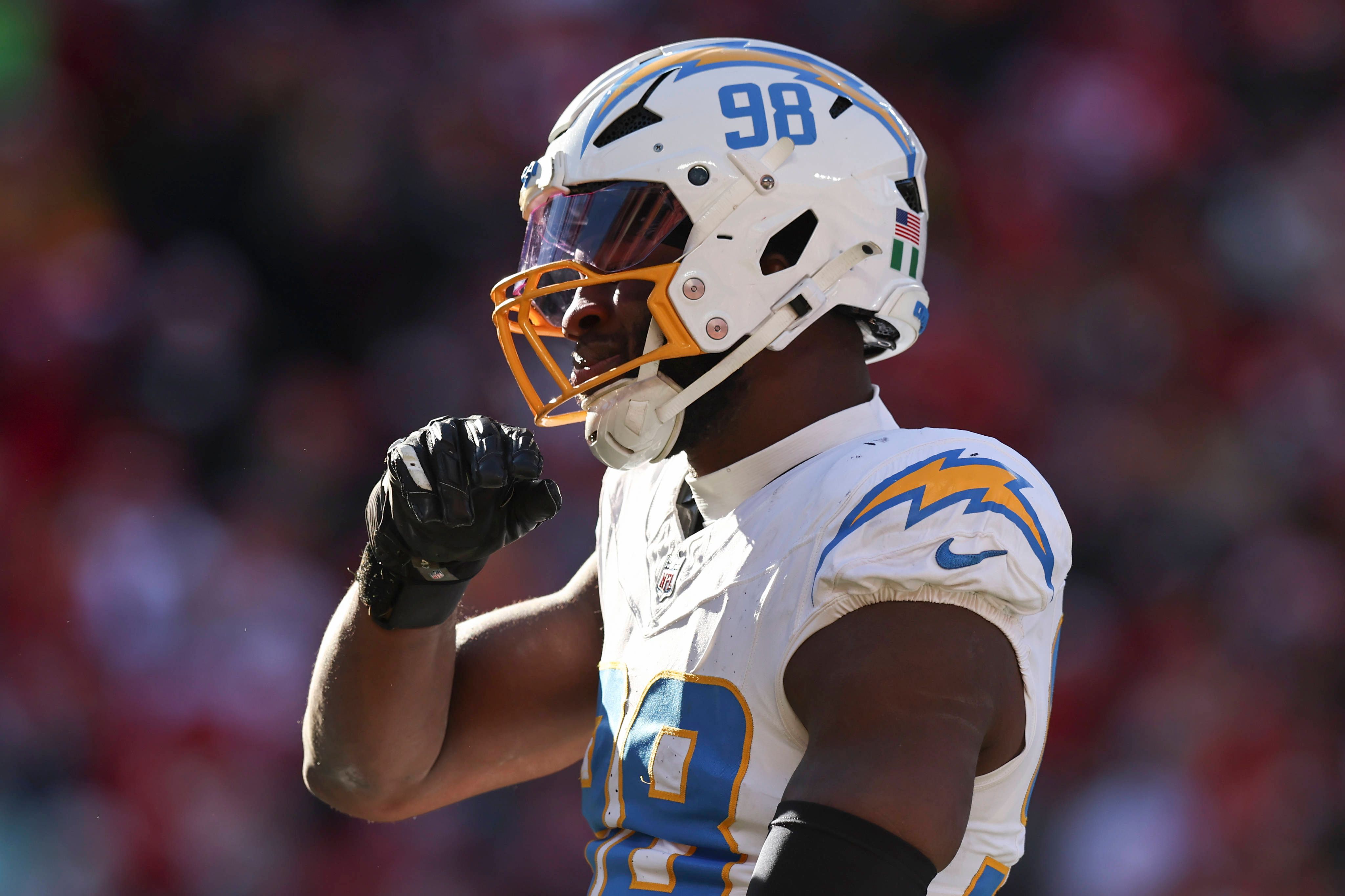 KANSAS CITY, MO - DECEMBER 14: Los Angeles Chargers linebacker Odafe Oweh (98) after a sack in the third quarter of an NFL, American Football Herren, USA game between the Los Angeles Chargers and K...