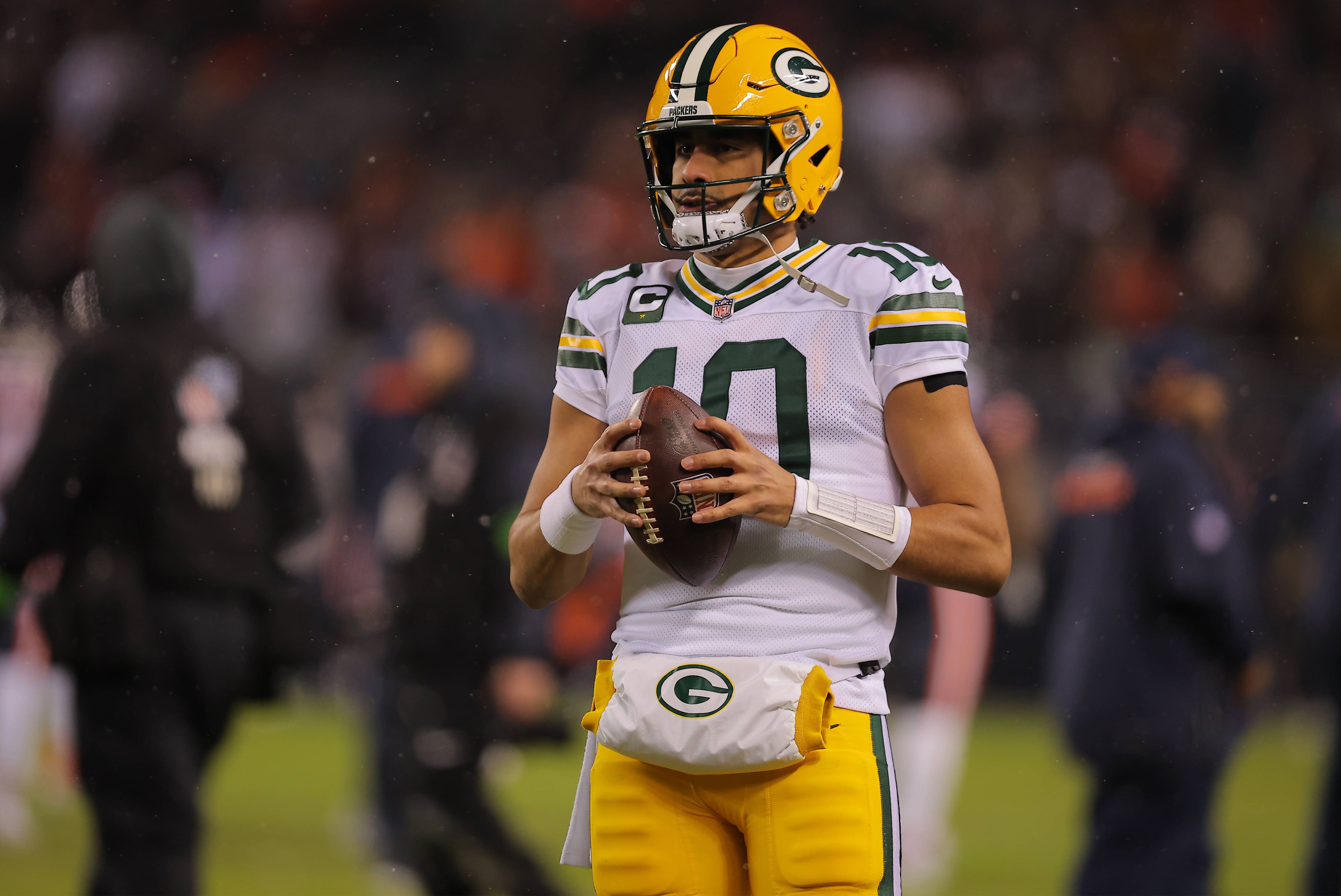 CHICAGO, IL - JANUARY 10: Jordan Love 10 of the Green Bay Packers prior to a NFC Wild Card Playoff game against the Chicago Bears on January 10, 2026 at Soldier Field in Chicago, Illinois. (Photo b...