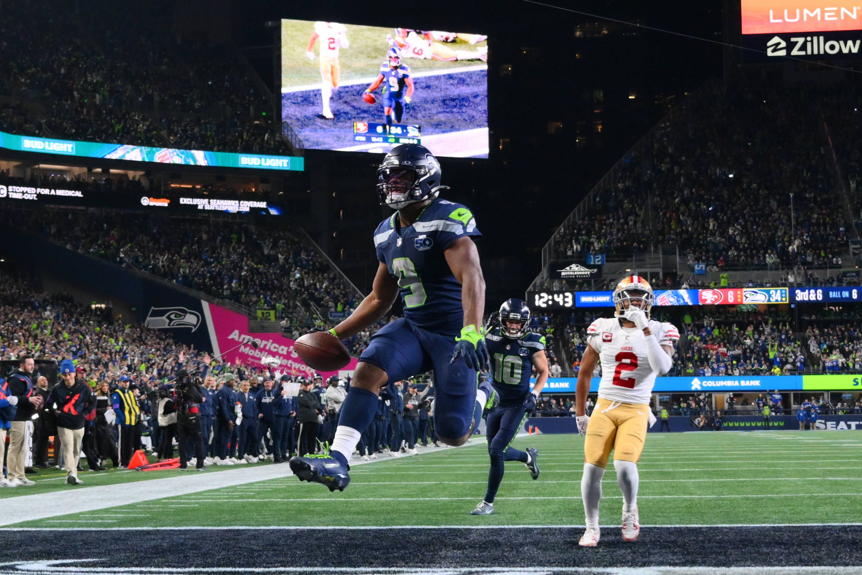 NFL, American Football Herren, USA NFC Divisional Round-San Francisco 49ers at Seattle Seahawks Jan 17, 2026; Seattle, WA, USA; Seattle Seahawks running back Kenneth Walker III (9) carries the ball...