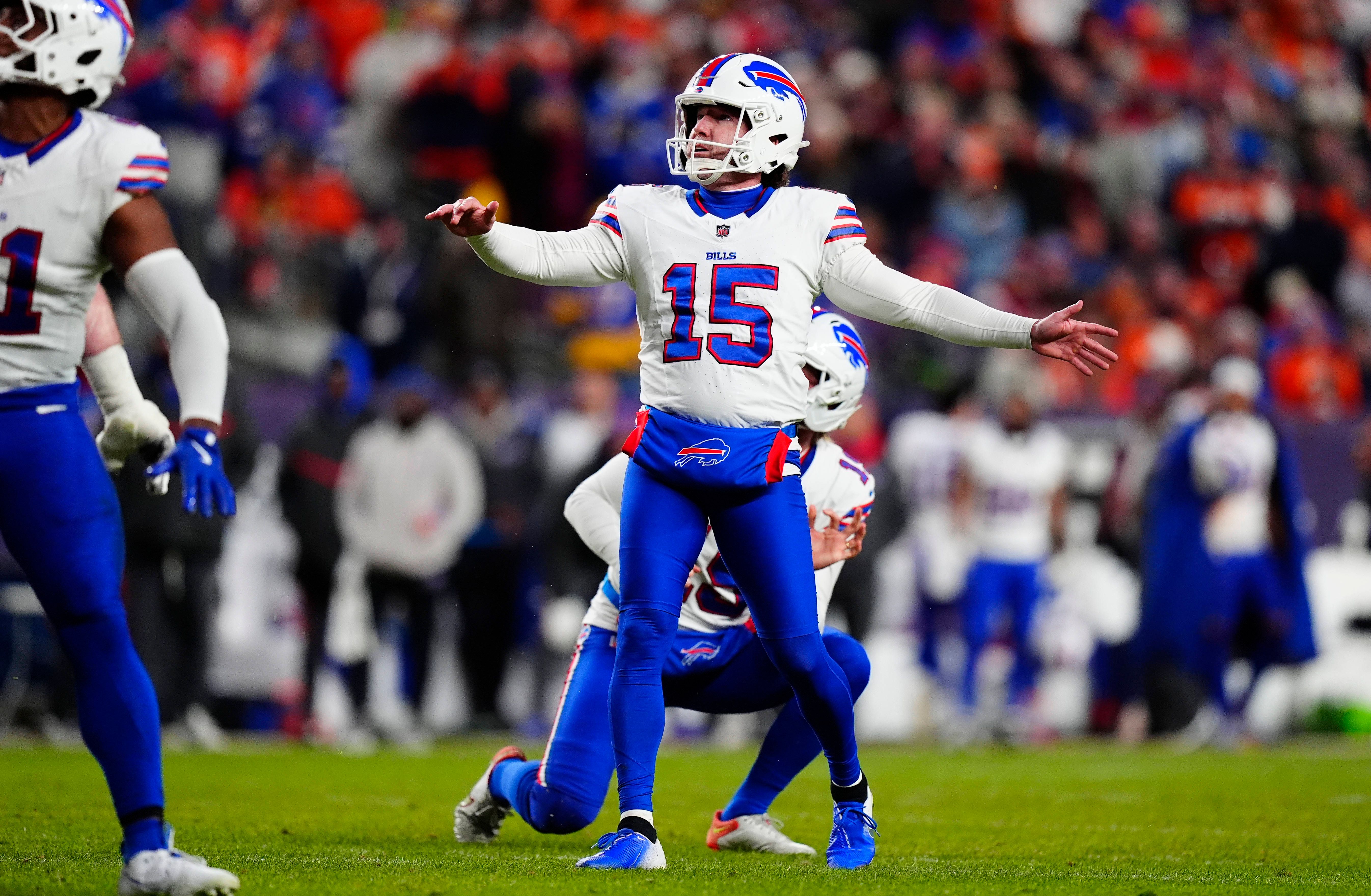 NFL, American Football Herren, USA AFC Divisional Round-Buffalo Bills at Denver Broncos Jan 17, 2026; Denver, CO, USA; Buffalo Bills place kicker Matt Prater (15) kicks a field goal out of the hold...