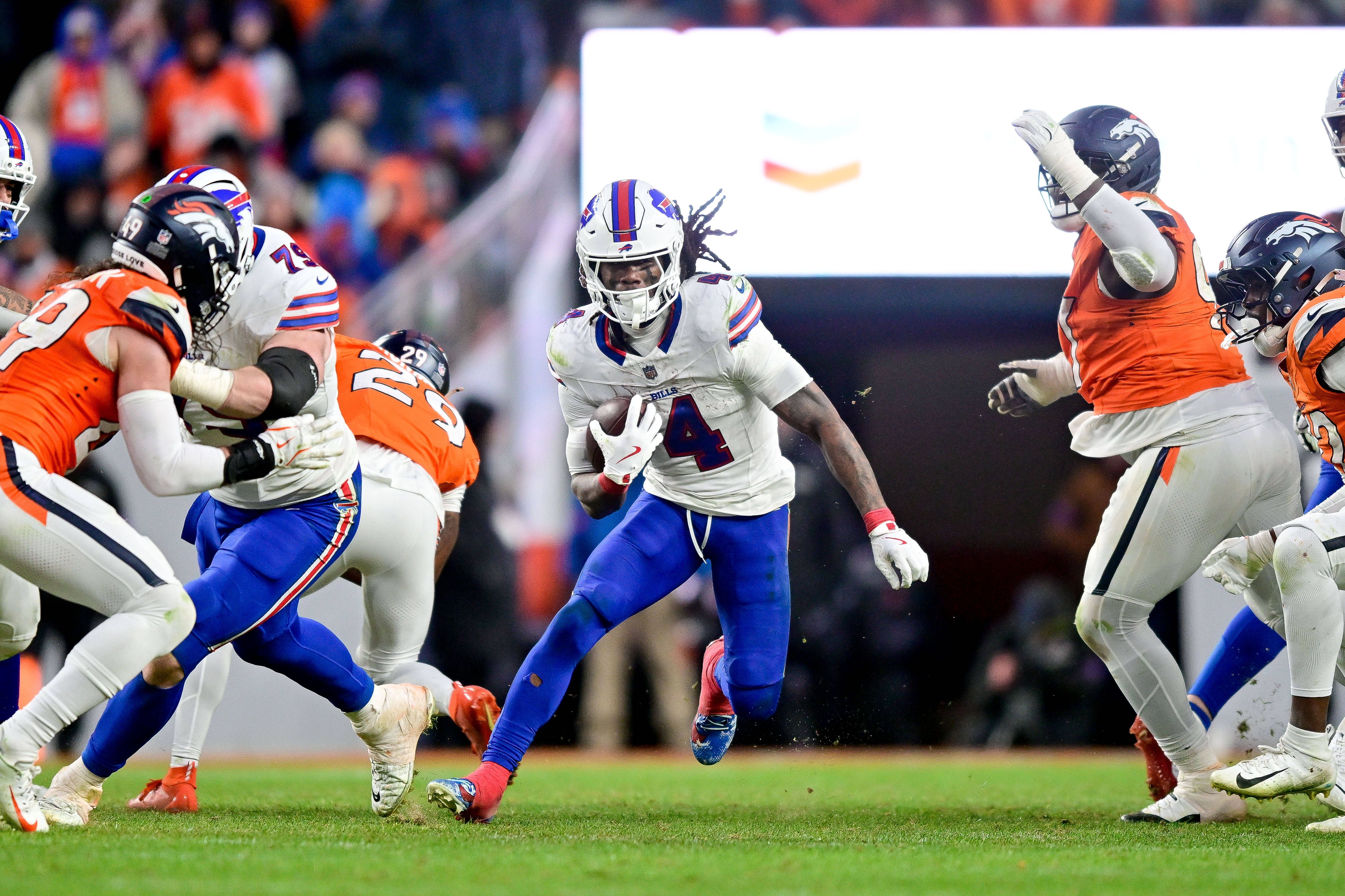 DENVER, CO - JANUARY 17: Buffalo Bills running back James Cook III (4) carries the ball against the Denver Broncos in the fourth quarter of the AFC Divisional Round game at Empower Field at Mile Hi...