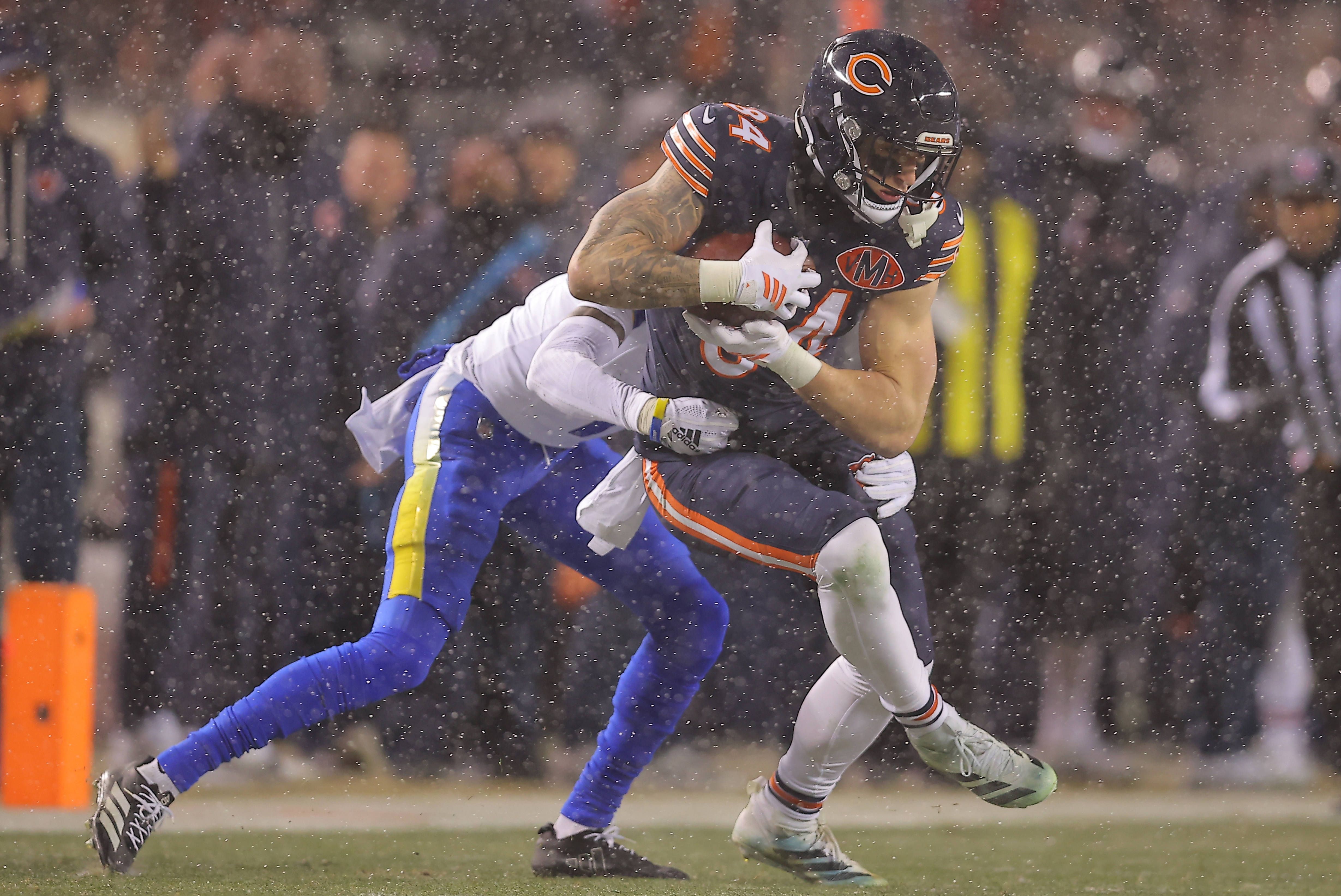 CHICAGO, IL - JANUARY 18: Colston Loveland 84 of the Chicago Bears makes a catch during the first half of the NFC Divisional Round playoff gameagainst the Los Angeles Rams on January 18, 2026 at So...