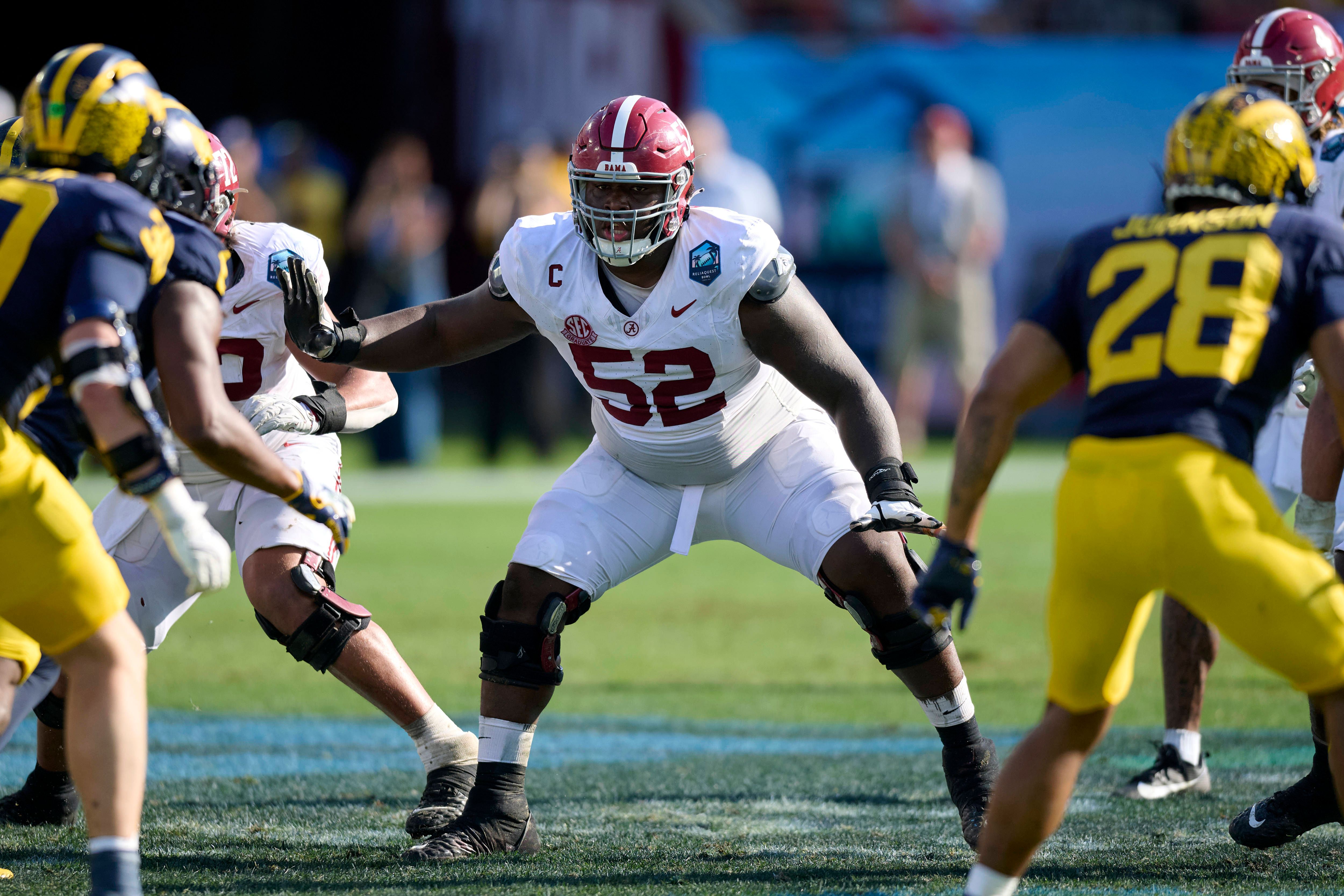 December 31, 2024: Alabama offensive lineman Tyler Booker (52) blocking during an NCAA, College League, USA football game between the Michigan Wolverines and Alabama Crimson Tide at Raymond James S...