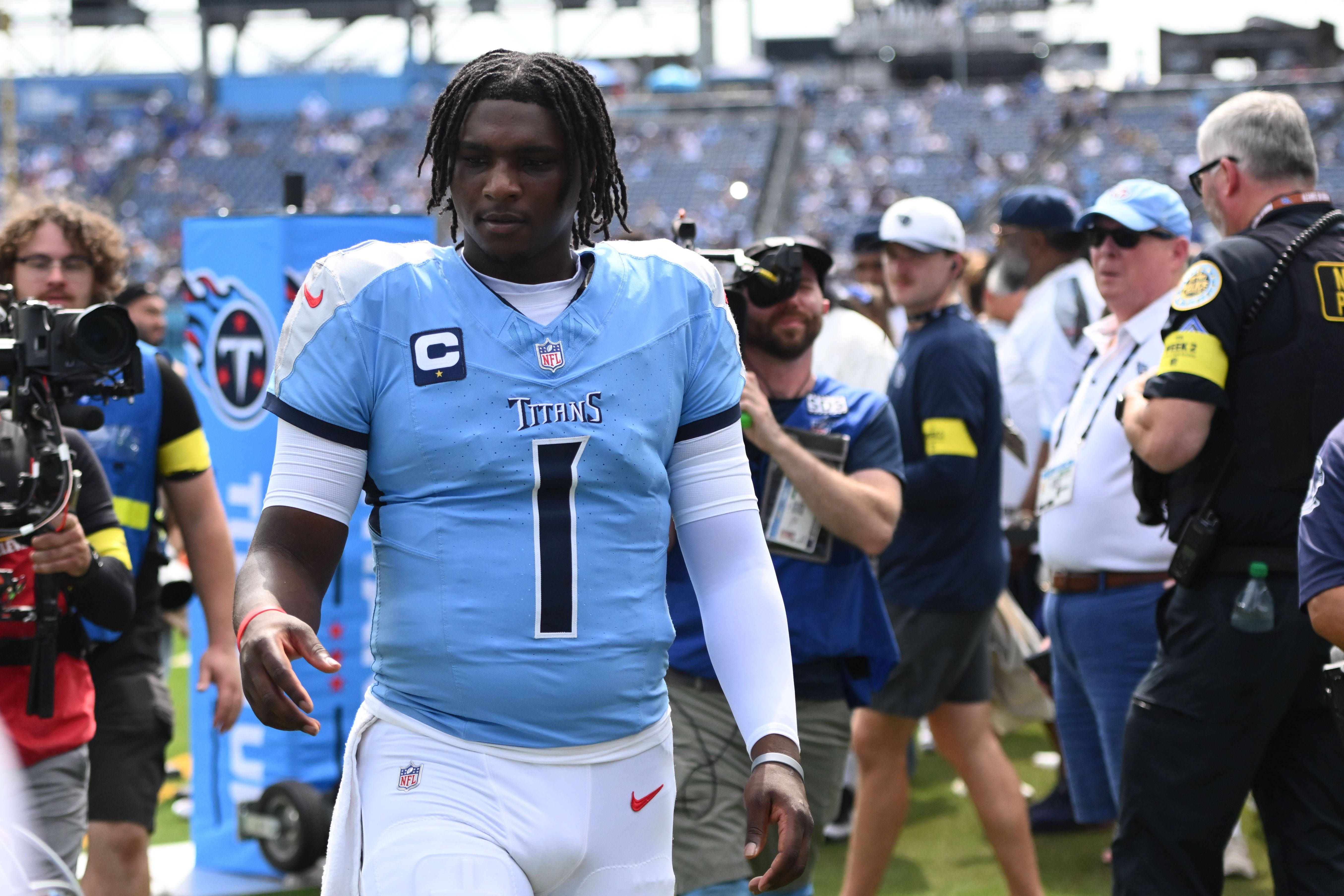 NFL, American Football Herren, USA Los Angeles Rams at Tennessee Titans Sep 14, 2025; Nashville, Tennessee, USA; Tennessee Titans quarterback Cam Ward (1) before the game against the Los Angeles Ra...