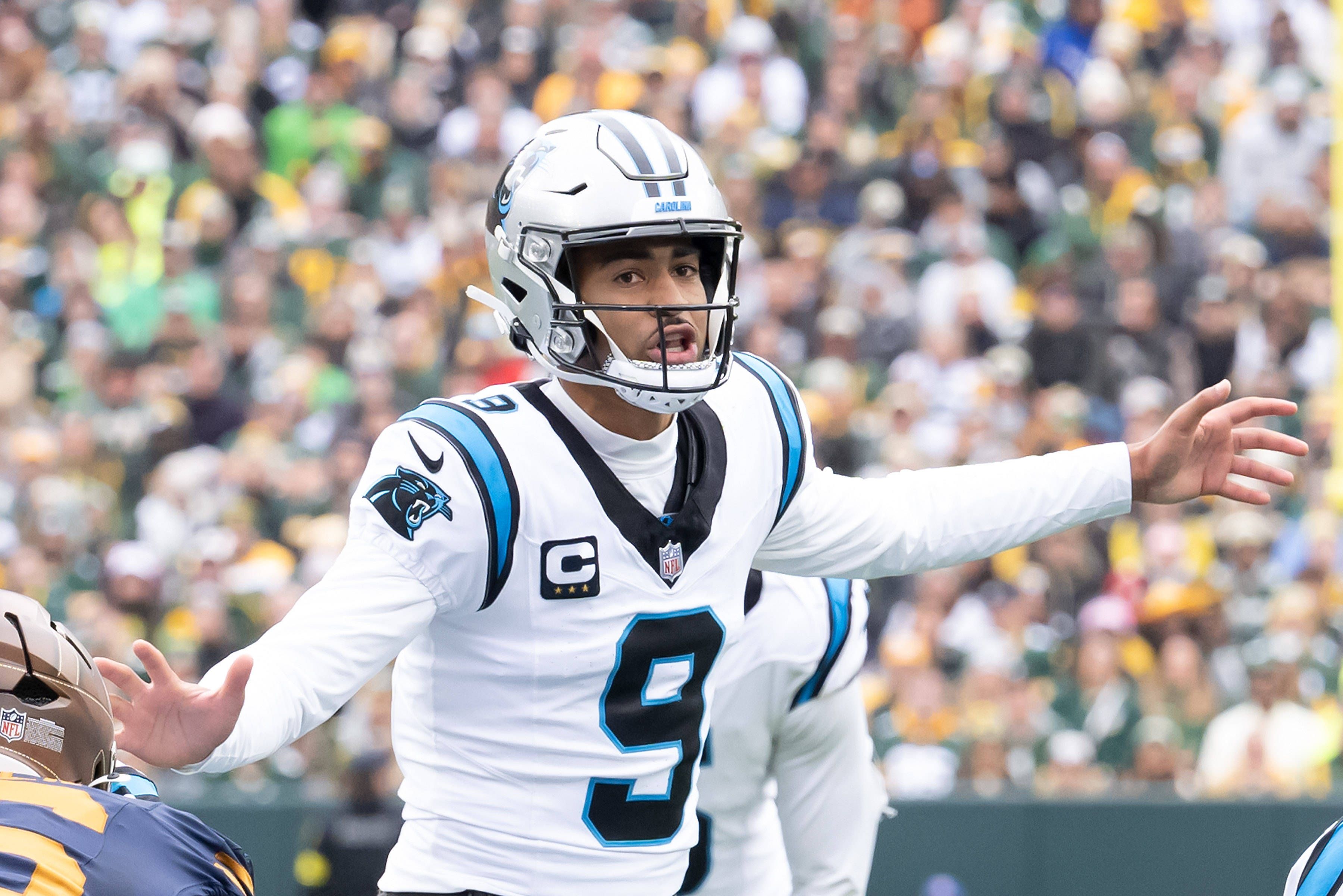 November 2, 2025: Carolina Panthers quarterback Bryce Young (9) calls a play during a game against the Green Bay Packers in Green Bay, WI. Panthers defeated Packers, 16-13. Cal Media. Green Bay Uni...