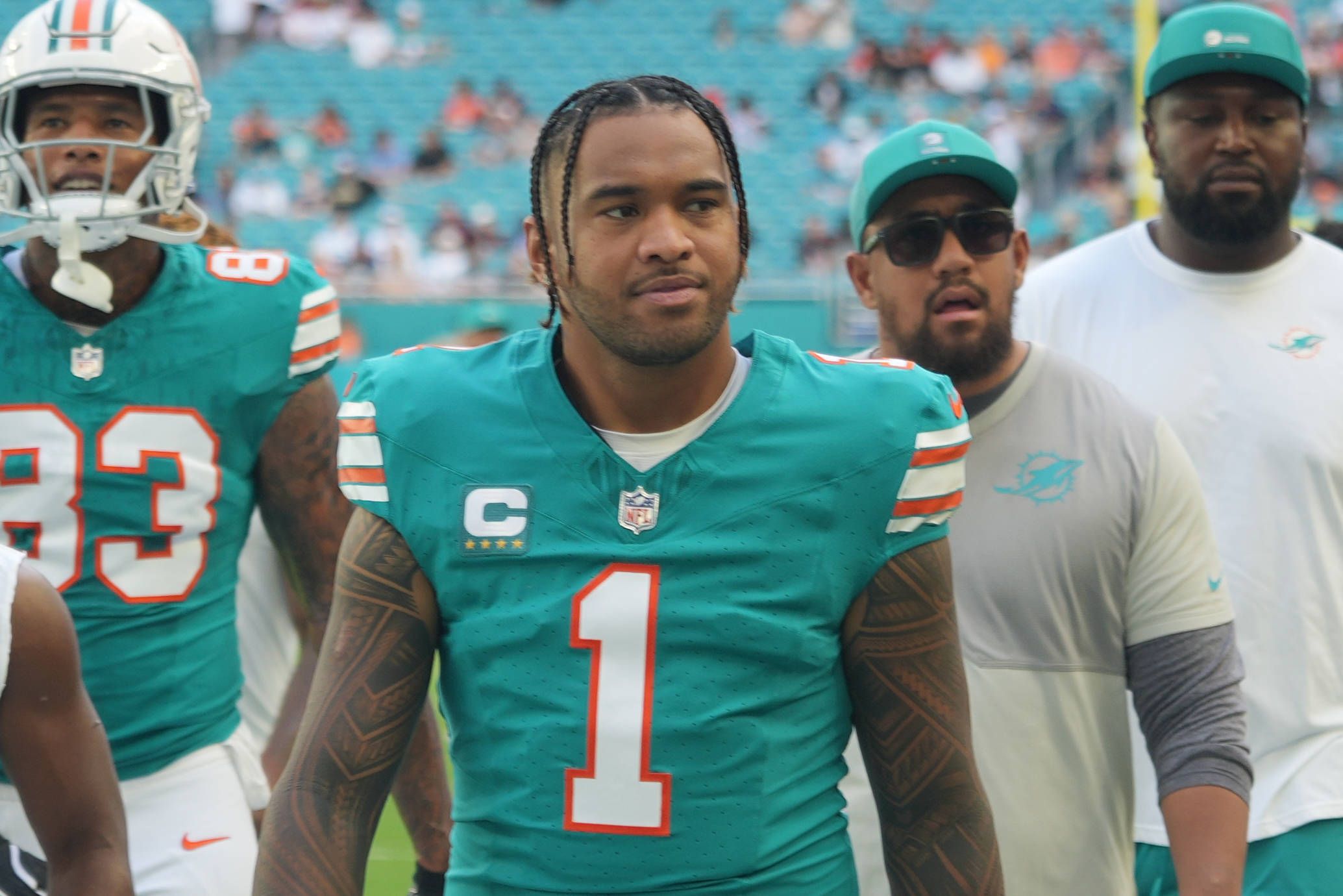 MIAMI GARDENS, FL - DECEMBER 21: Miami Dolphins quarterback Tua Tagovailoa (1) leaves the field following pregame warmsups before the game between the Cincinnati Bengals and the Miami Dolphins on S...