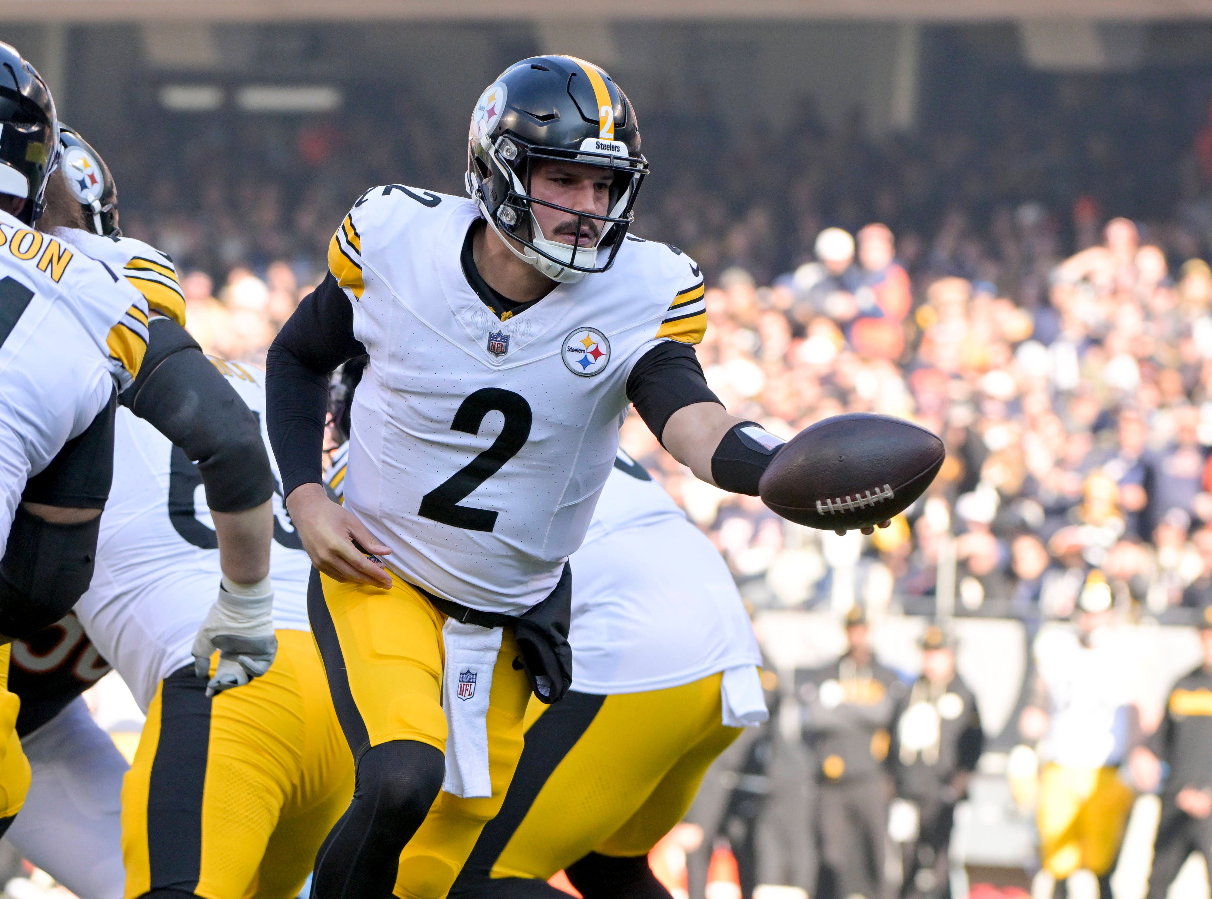 Pittsburgh Steelers quarterback Mason Rudolph (2) hands off the ball during the first quarter against the Chicago Bears at Soldier Field in Chicago on Sunday, November 23, 2025. PUBLICATIONxNOTxINx...