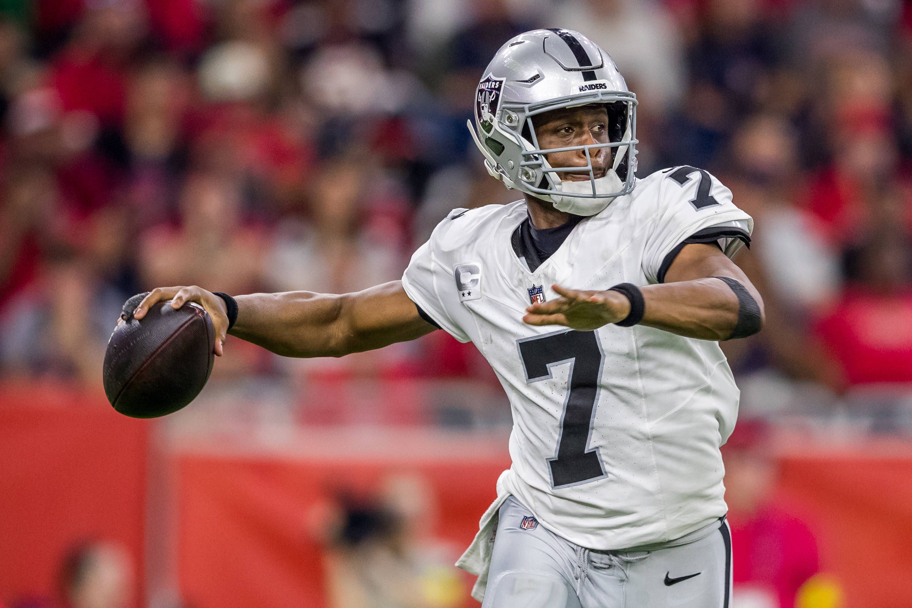 December 21, 2025: Las Vegas Raiders quarterback Geno Smith (7) drops back for a pass during the NFL, American Football Herren, USA game between the Las Vegas Raiders and the Houston Texans in Hous...