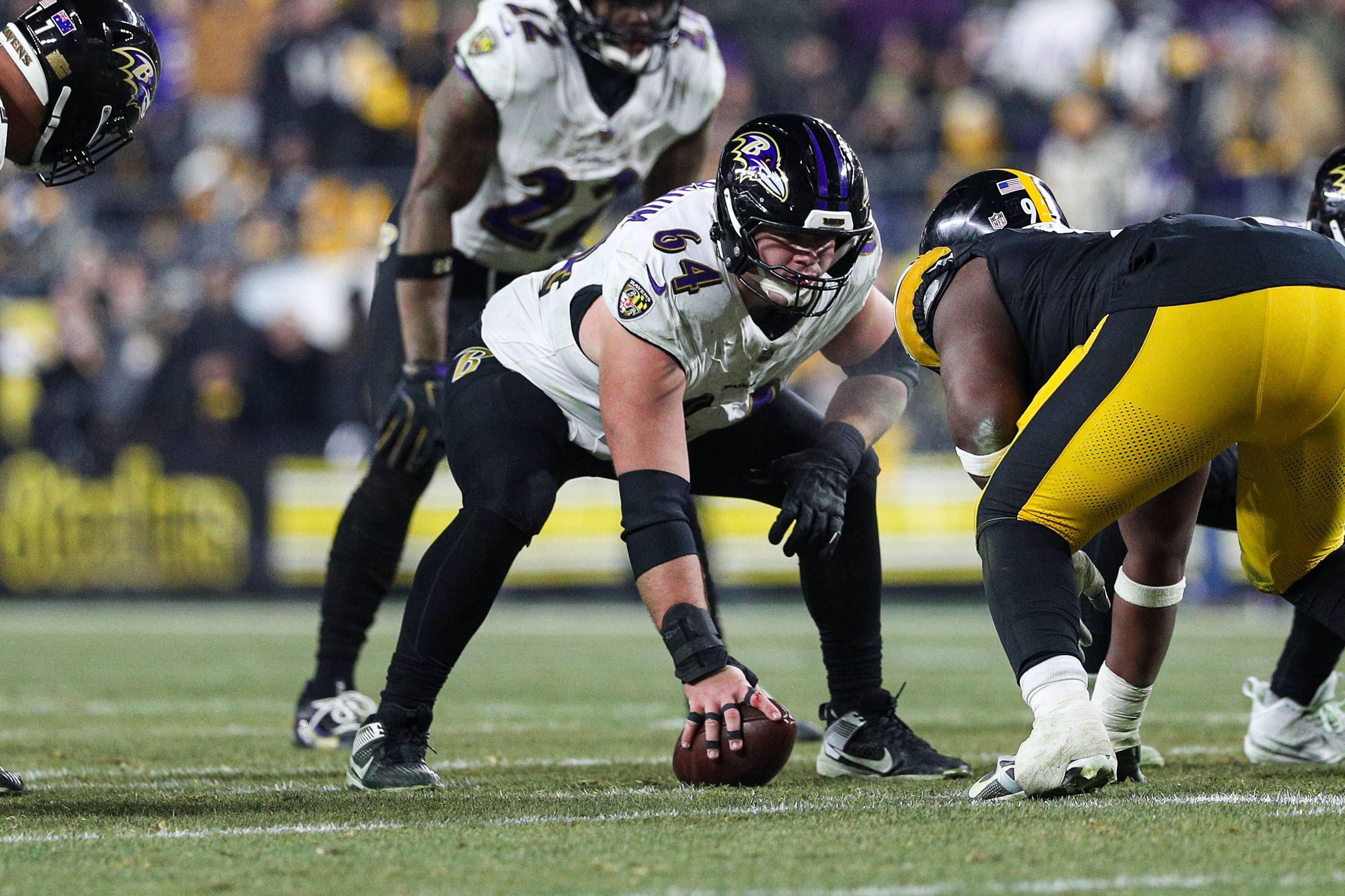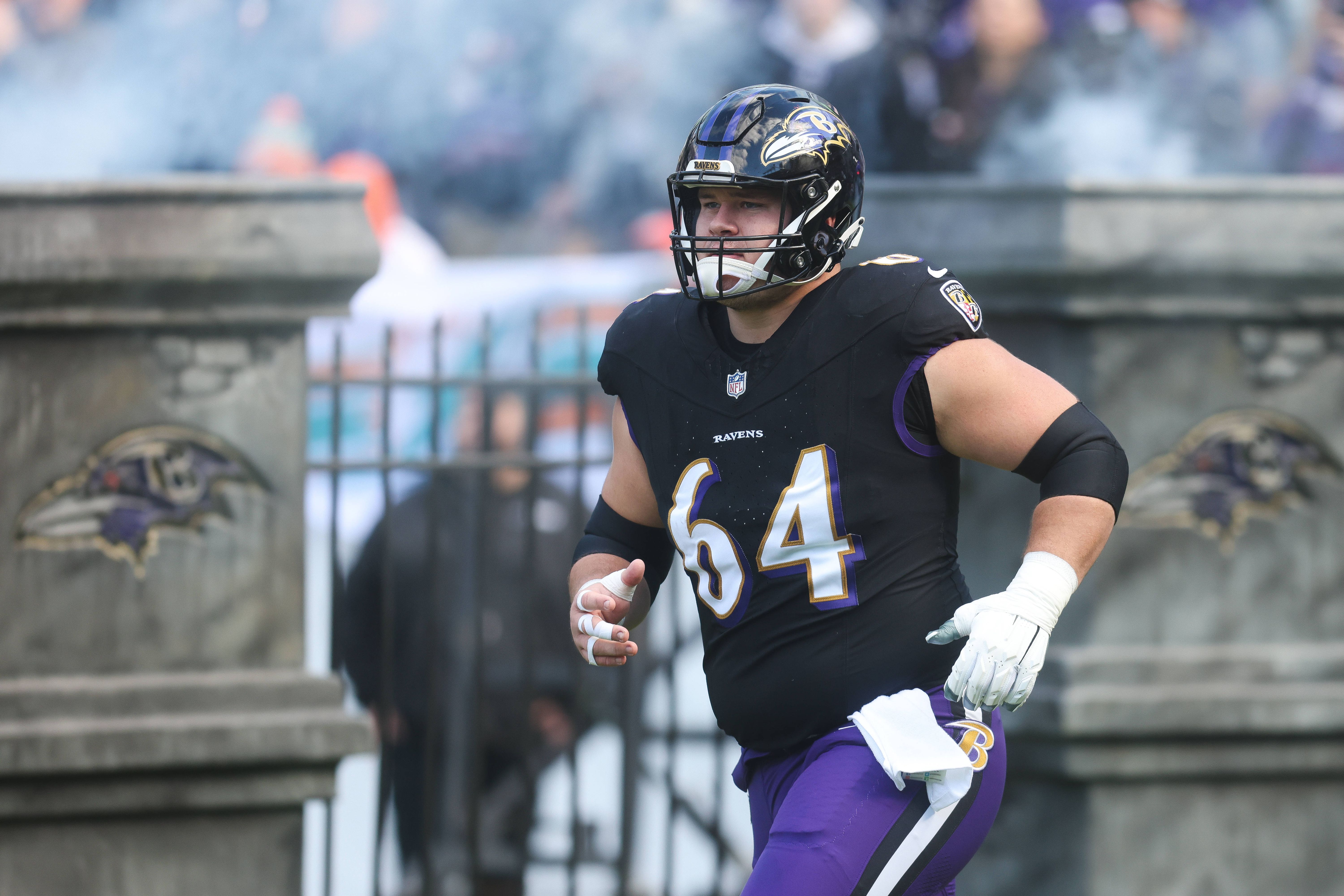 PITTSBURGH, PA - JANUARY 04: Baltimore Ravens center Tyler Linderbaum (64) looks on during the NFL, American Football Herren, USA football game between the Baltimore Ravens and Pittsburgh Steelers ...