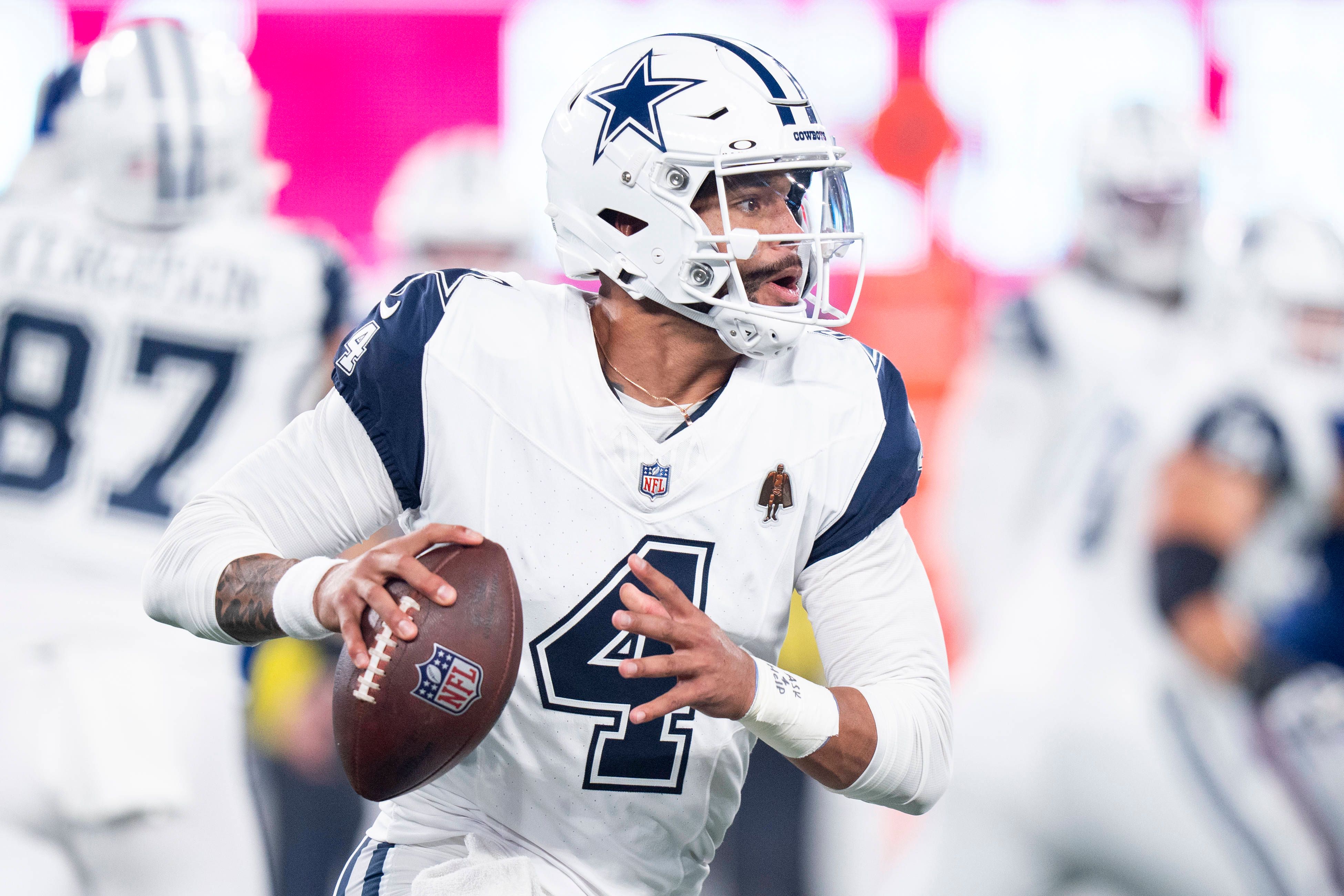 Dallas Cowboys quarterback Dak Prescott (4) in action during the NFL, American Football Herren, USA football game against the New York Giants, Thursday, Sept. 26, 2024, in East Rutherford. The Cowb...