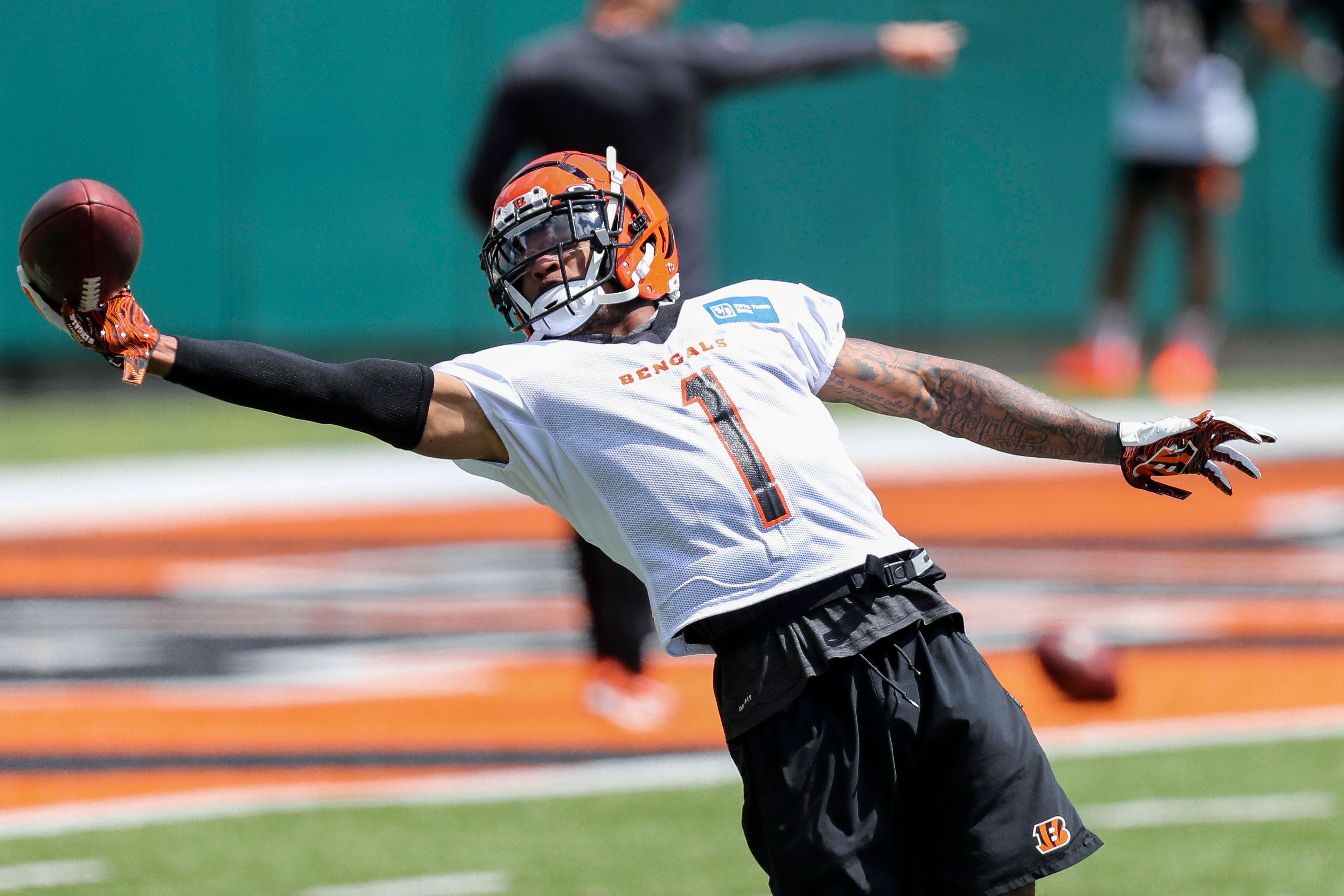 NFL, American Football Herren, USA Cincinnati Bengals Minicamp Jun 15, 2021; Cincinnati, Ohio, USA; Cincinnati Bengals wide receiver JaÕMarr Chase (1) catches a pass during minicamp at Paul Brown S...