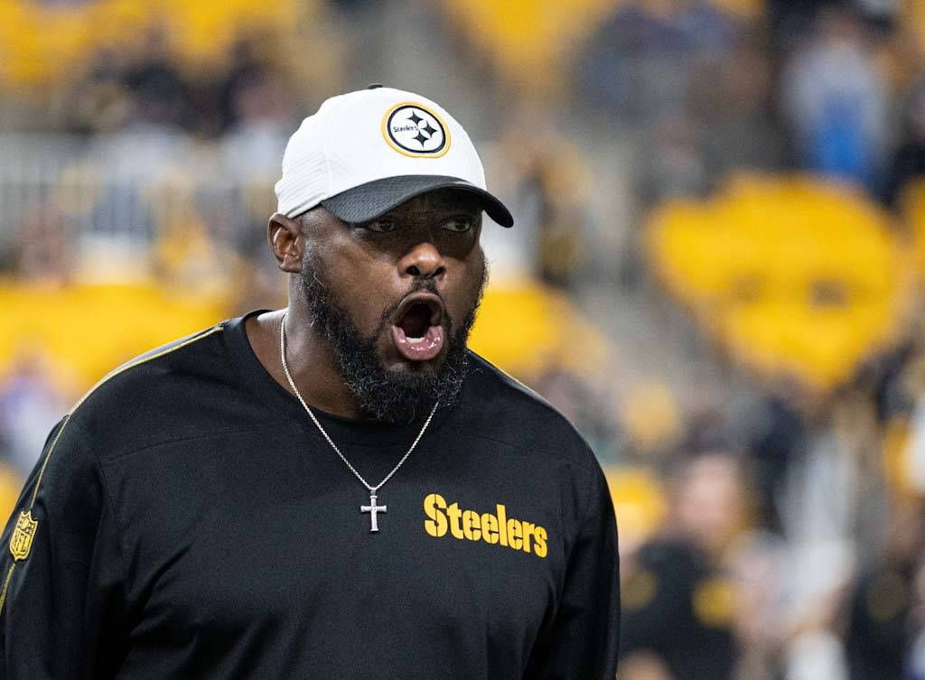PITTSBURGH, PA - October 28: Pittsburgh Steelers head coach Mike Tomlin encourages his players before the game between the Pittsburgh Steelers and the New York Giants at Acrisure Stadium on October...