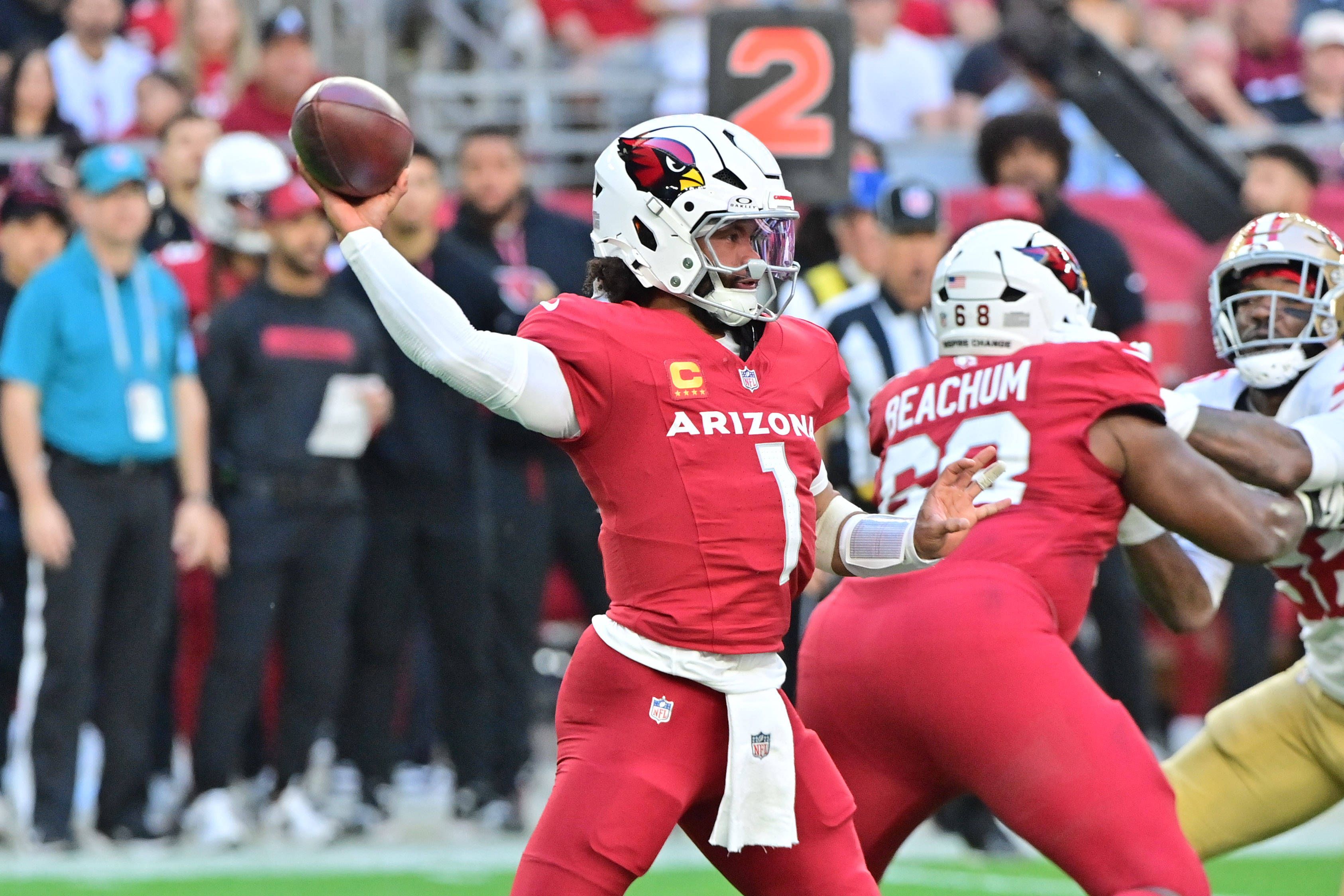 NFL, American Football Herren, USA San Francisco 49ers at Arizona Cardinals Jan 5, 2025; Glendale, Arizona, USA; Arizona Cardinals quarterback Kyler Murray (1) throws inthe first half against the S...