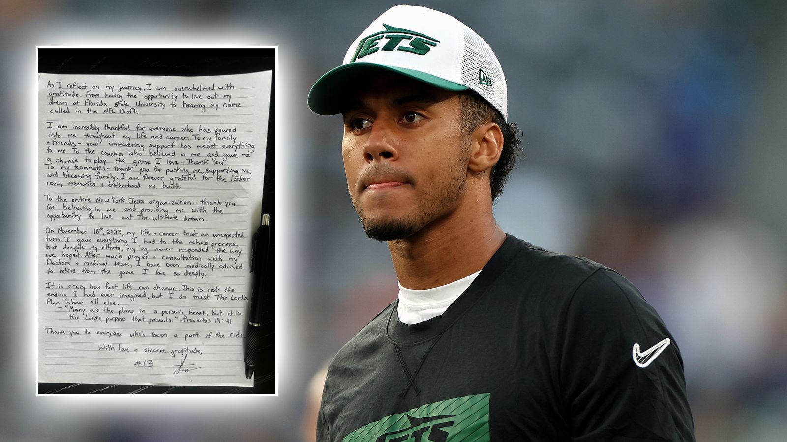 Der 24 Jahre alte Quarterback der Jets entschloss sich aufgrund der Folgen einer schweren Beinverletzung für den Rücktritt. "Ich habe alles für die Reha gegeben, aber trotz aller Bemühungen reagierte mein Bein nie so, wie wir es uns erhofft hatten", erklärte Travis in einem handschriftlichen Brief. Die folgenschwere Verletzung erlitt Travis im letzten Spiel am College für Florida State.Getty Images/twitter@NFL_DovKleiman