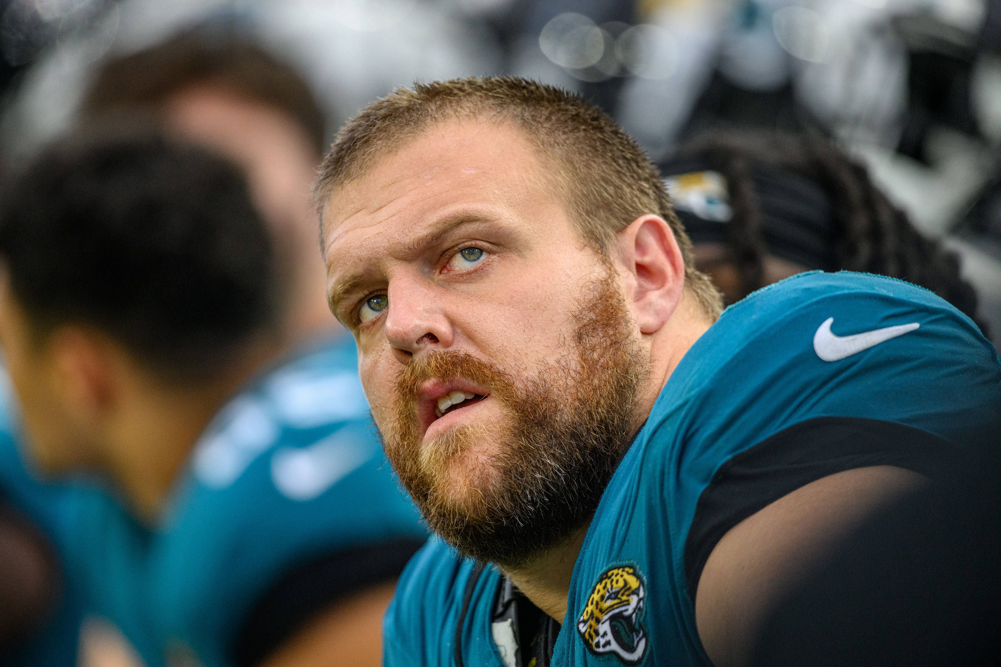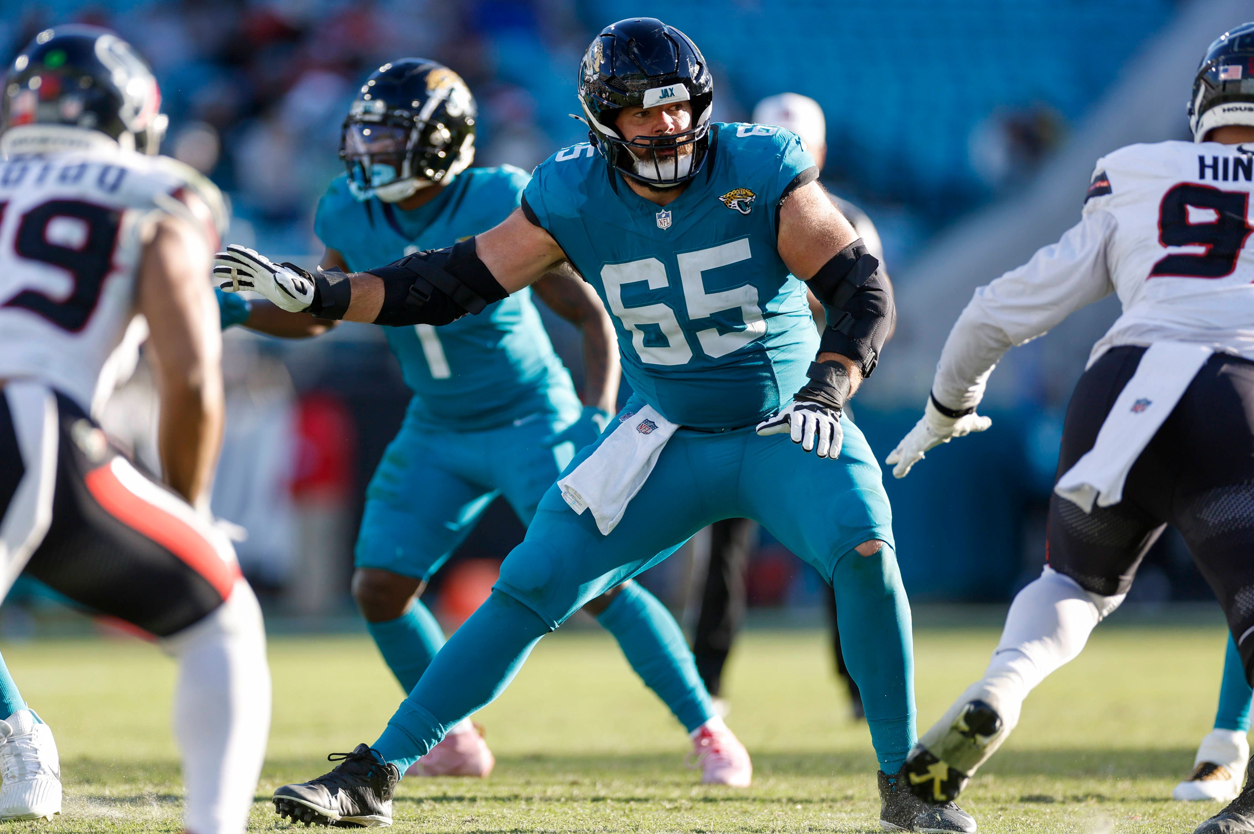 JACKSONVILLE, FL - DECEMBER 01: Jacksonville Jaguars center Mitch Morse (65) blocks during the game between the Jacksonville Jaguars and the Houston Texans on December 1, 2024 at EverBank Stadium i...