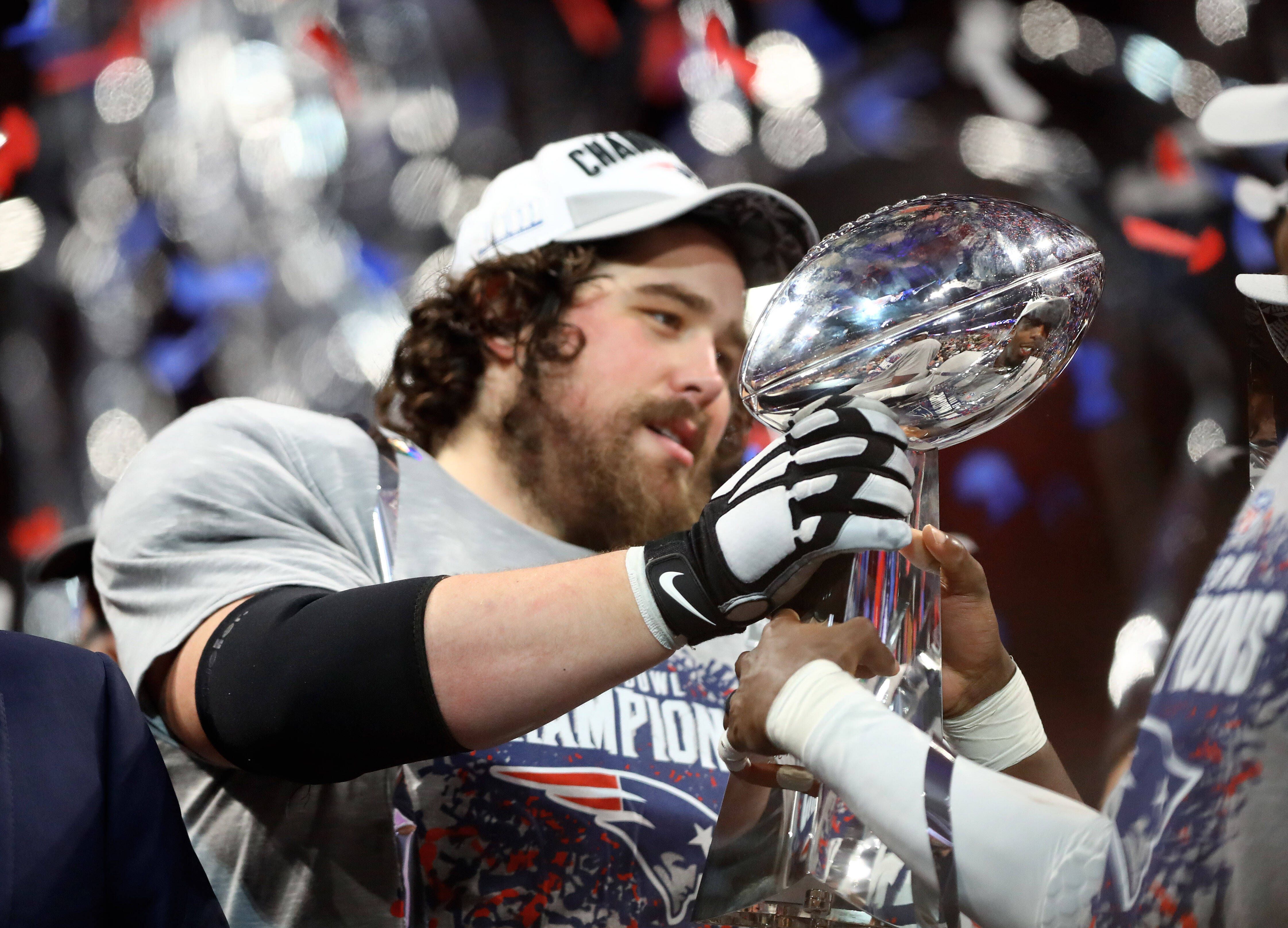 NFL, American Football Herren, USA Super Bowl LIII-New England Patriots vs Los Angeles Rams, Feb 3, 2019; Atlanta, GA, USA; New England Patriots center David Andrews (60) celebrates with the Vince ...