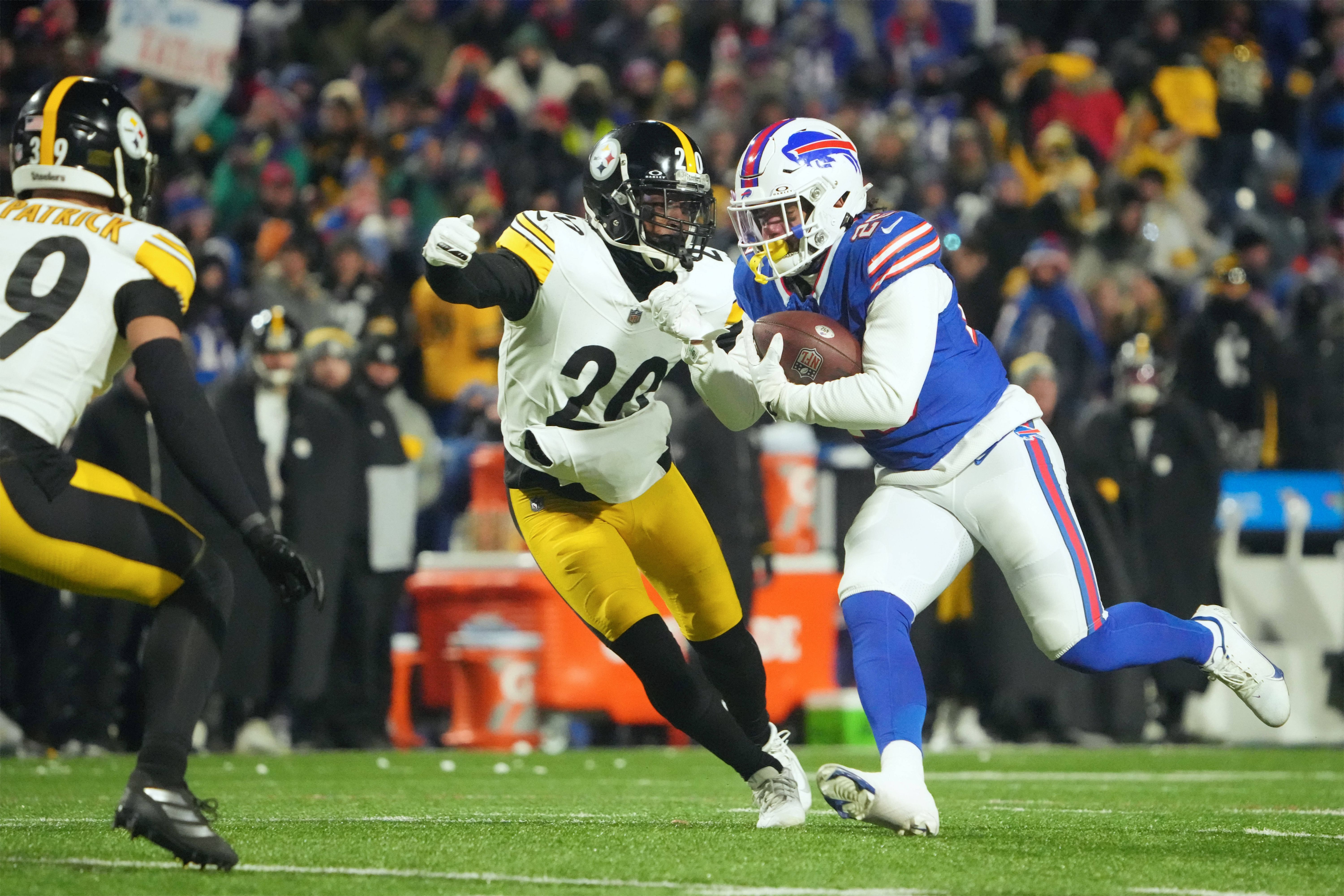 NFL, American Football Herren, USA AFC Wild Card Round-Pittsburgh Steelers at Buffalo Bills Jan 15, 2024; Orchard Park, New York, USA; Buffalo Bills running back Damien Harris (22) runs the ball pr...