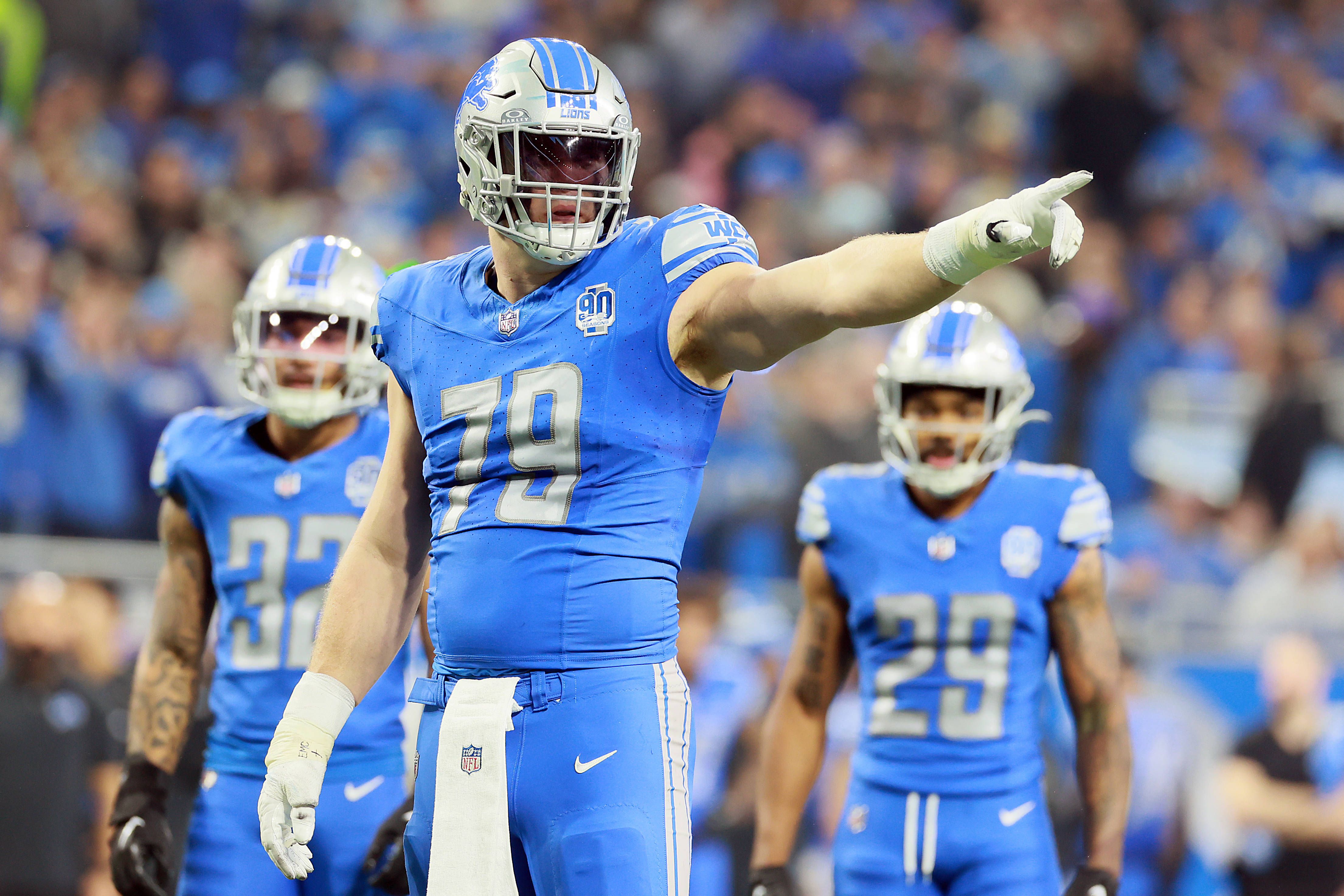Los Angeles Rams vs Detroit Lions Detroit Lions defensive end John Cominsky (79) gestures between plays during an NFC Wildcard Playoffs game between the Detroit Lions and the Los Angeles Rams in De...