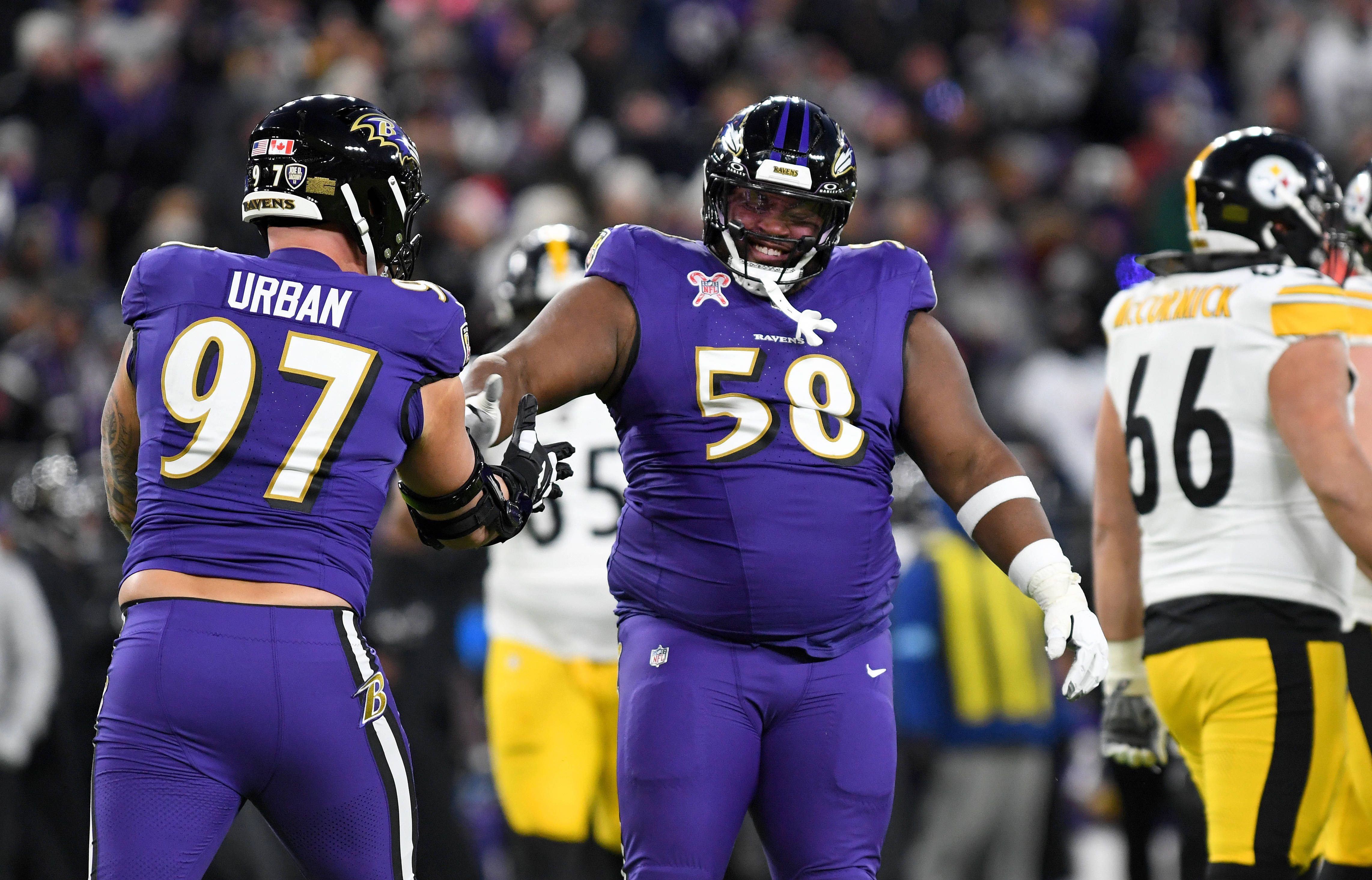 BALTIMORE, MD - DECEMBER 21: Ravens defensive tackle Michael Pierce (58) celebrates after a sack during the Pittsburgh Steelers versus Baltimore Ravens NFL, American Football Herren, USA game at M&...