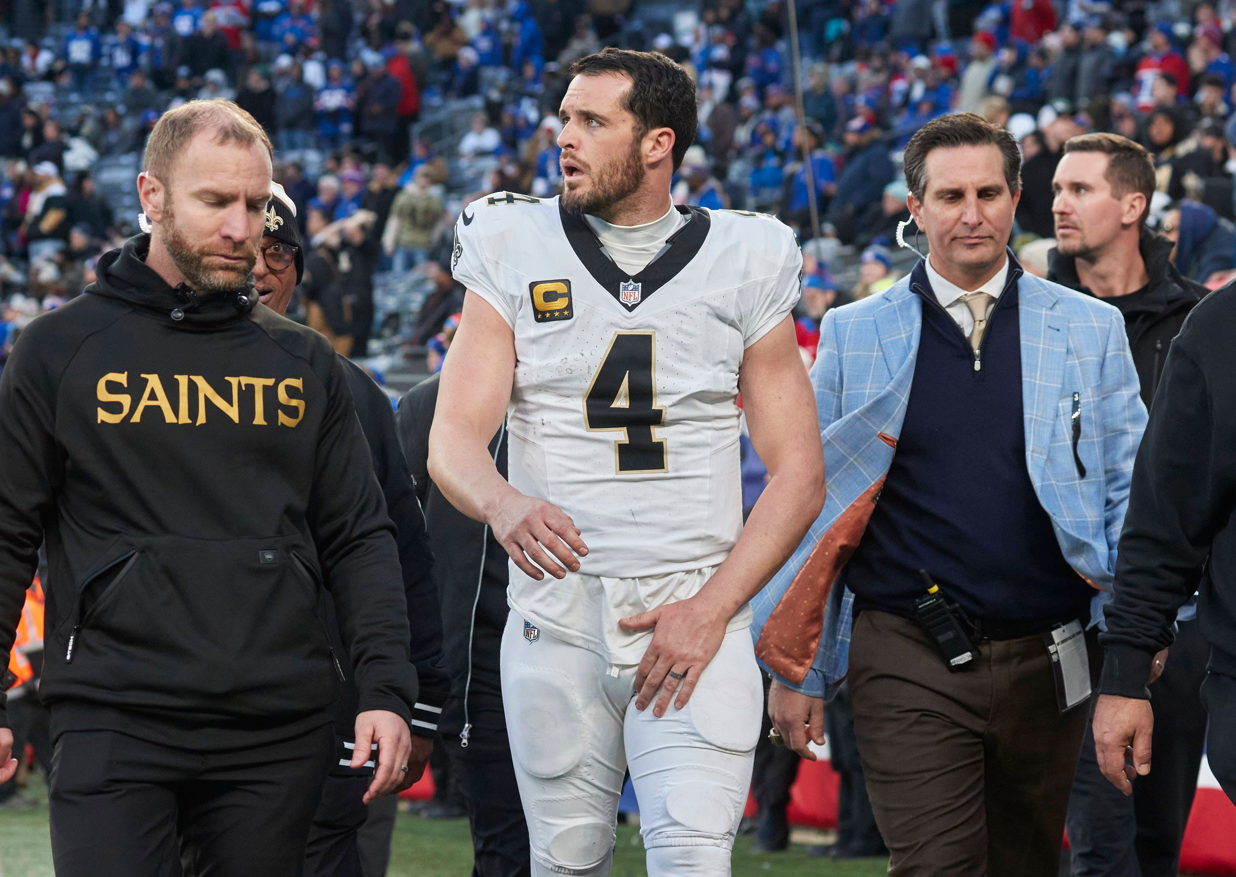 New Orleans Saints quarterback Derek Carr (4) is taken off the field to get checked after going air bourne on a scramble against the New York Giants during a NFL, American Football Herren, USA game...