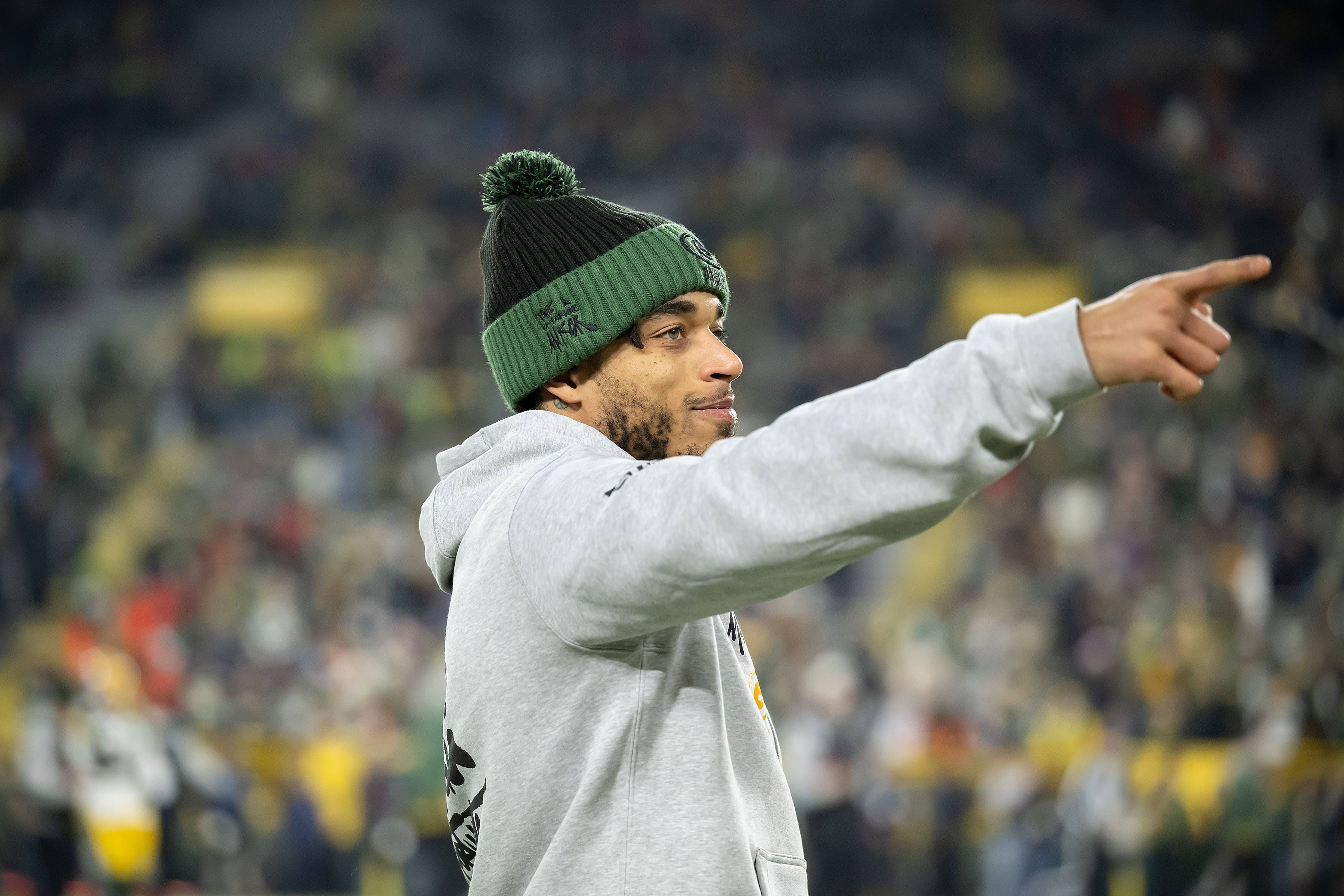 December 23, 2024: Green Bay Packers cornerback Jaire Alexander (23) greets fans before the game against the New Orleans Saints in Green Bay, WI. Cal Media. Green Bay United States of America - ZUM...