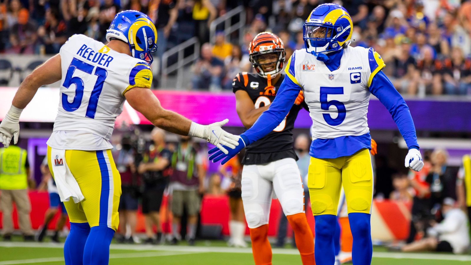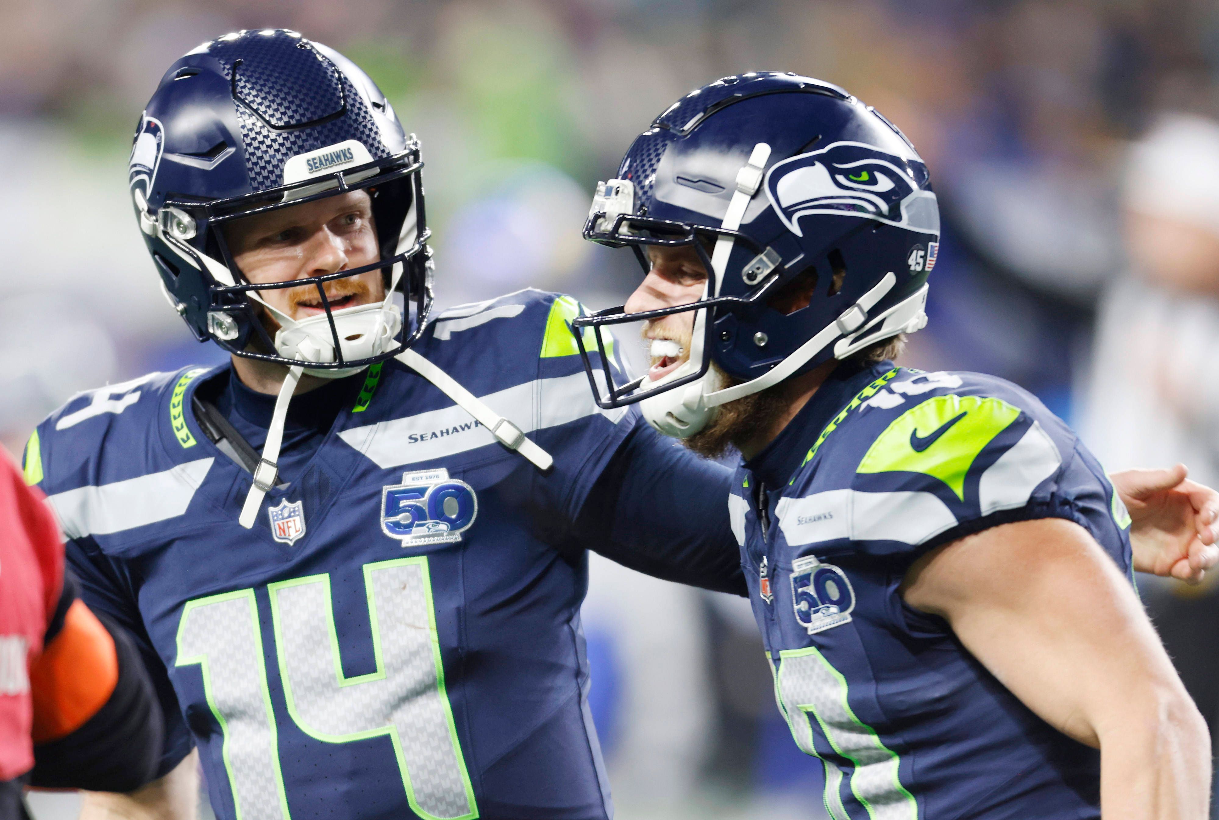 Seattle Seahawks quarterback Sam Darnold (14) celebrates with wide receiver Cooper Kupp (10) after the Seahawks defeated the Los Angeles Rams 31-27 to win their NFL, American Football Herren, USA C...