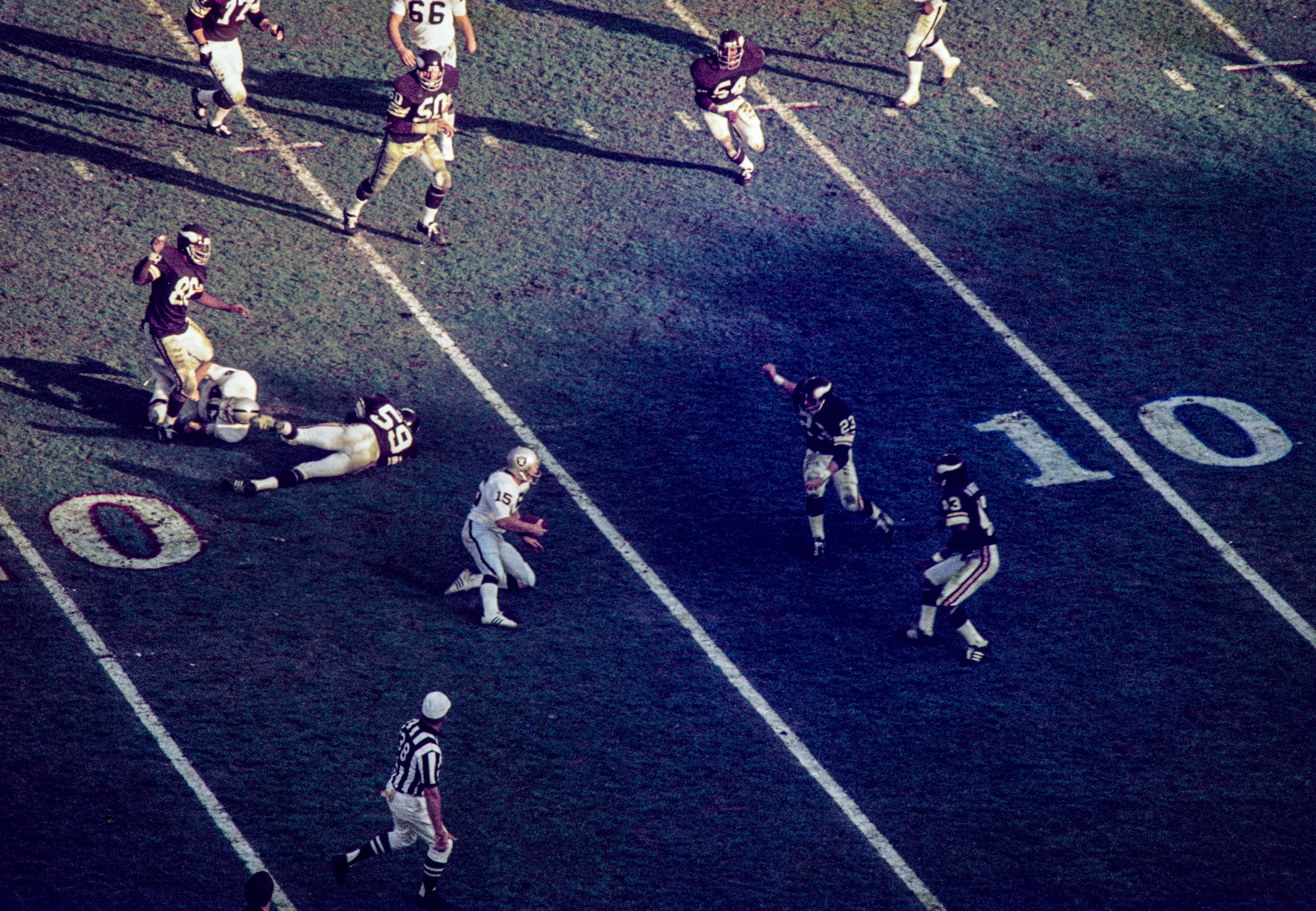 NFL, American Football Herren, USA USA TODAY Sports-Archive Jan 9, 1977; Pasadena, CA, USA; FILE PHOTO; Oakland Raiders quarterback Mike Rae (15) carries the ball against Minnesota Vikings defensiv...