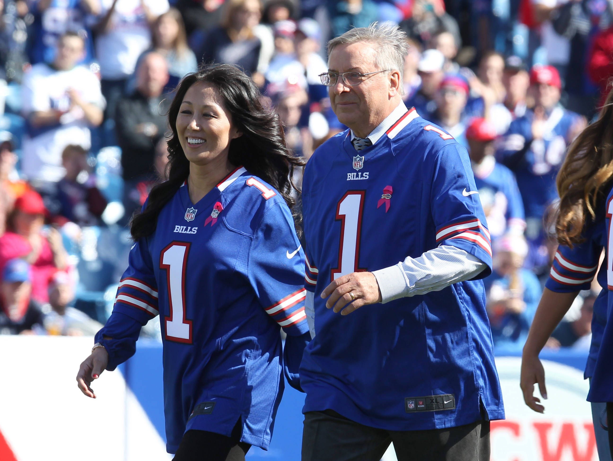 NFL, American Football Herren, USA New England Patriots at Buffalo Bills Oct 12, 2014; Orchard Park, NY, USA; New Buffalo Bills owners Kim and Terry Pegula walk on the field before a game against t...