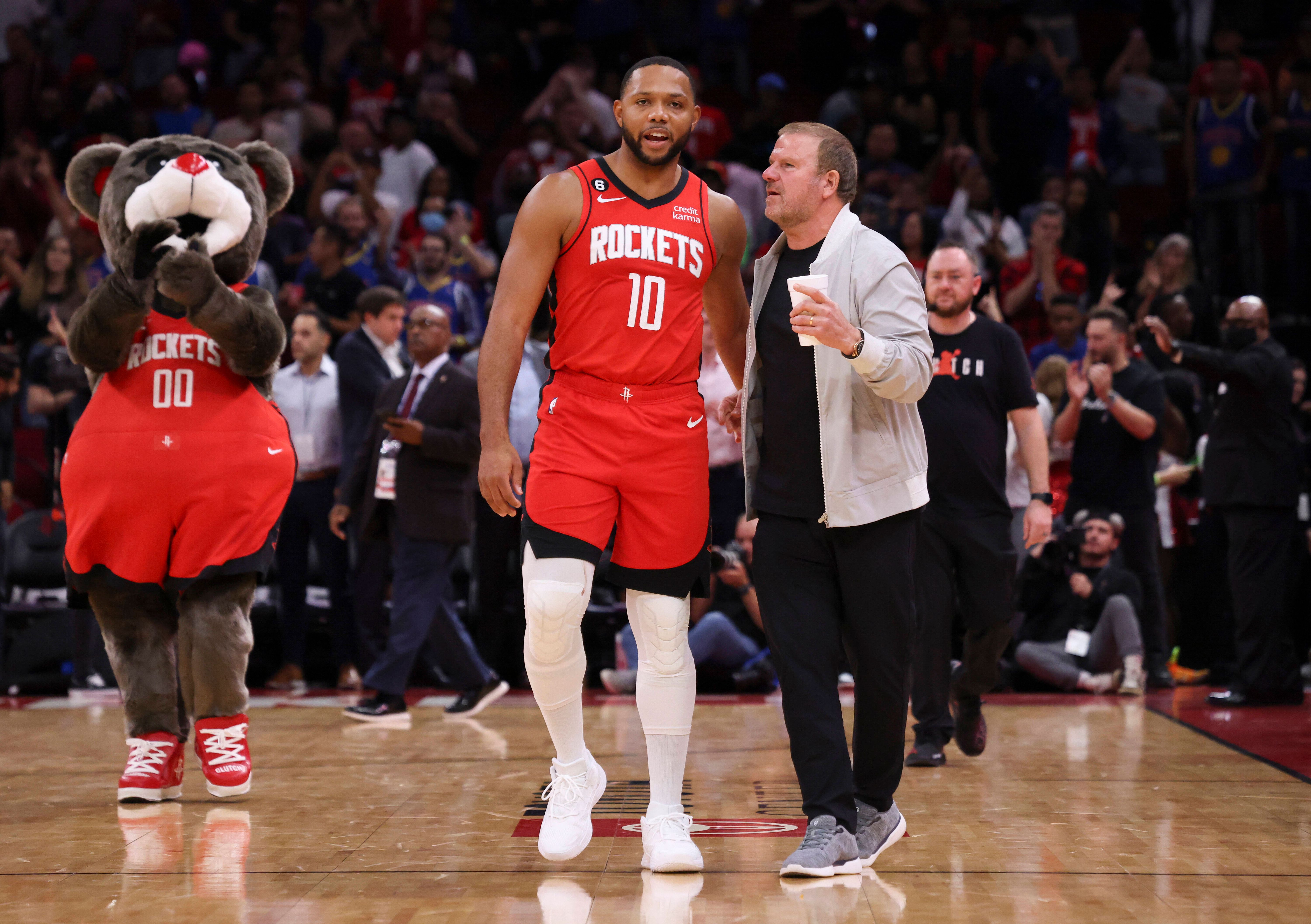NBA, Basketball Herren, USA Utah Jazz at Houston Rockets Oct 24, 2022; Houston, Texas, USA; Houston Rockets owner Tilman Fertitta hugs guard Eric Gordon (10) after defeating the Utah Jazz at Toyota...