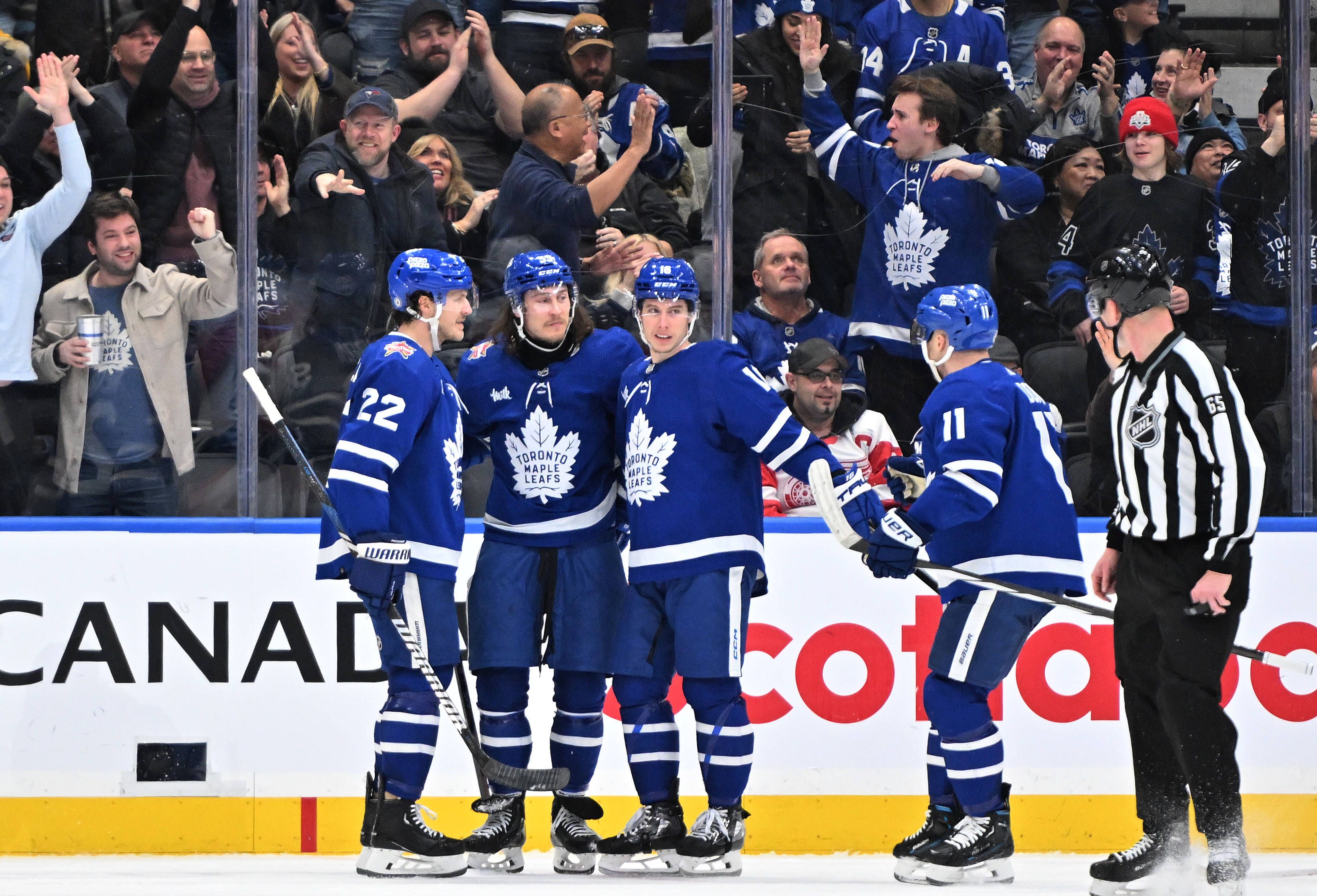 NHL, Eishockey Herren, USA Detroit Red Wings at Toronto Maple Leafs Jan 14, 2024; Toronto, Ontario, CAN; Toronto Maple Leafs forward Mitchell Marner (16) celebrates with teammates after scoring aga...