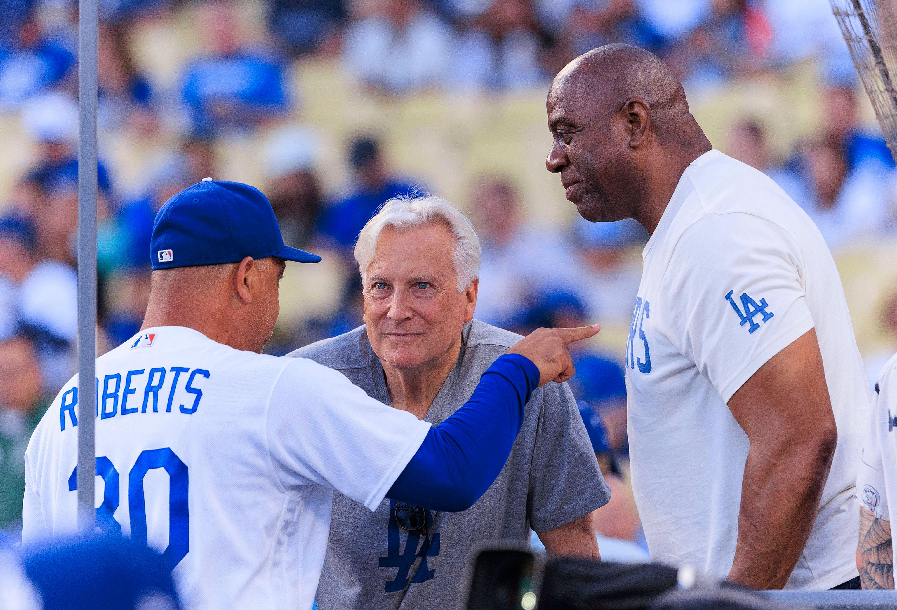 August 18, 2023, Los Angeles, California, USA: Manager, Dave Roberts chats with Dodgers owner, Mark Walter and co-owner, Ervin Magic Johnson prior to the MLB, Baseball Herren, USA regular season ga...