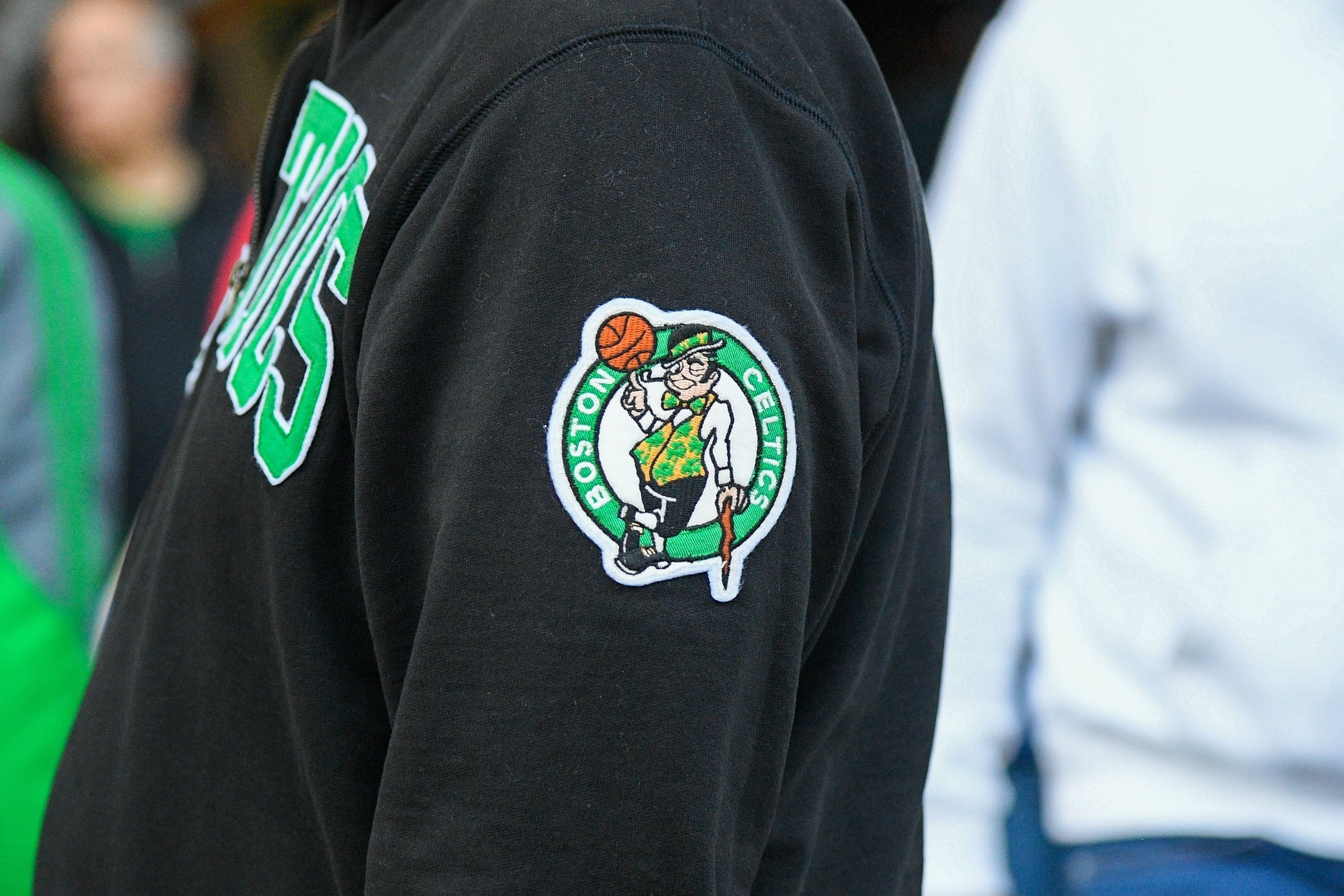 BOSTON, MA - MAY 09: A general view of the Boston Celtics logo on a fan s sweatshirt before Game 5 of the Eastern Conference Semifinals of the 2023 NBA, Basketball Herren, USA Playoffs between the ...