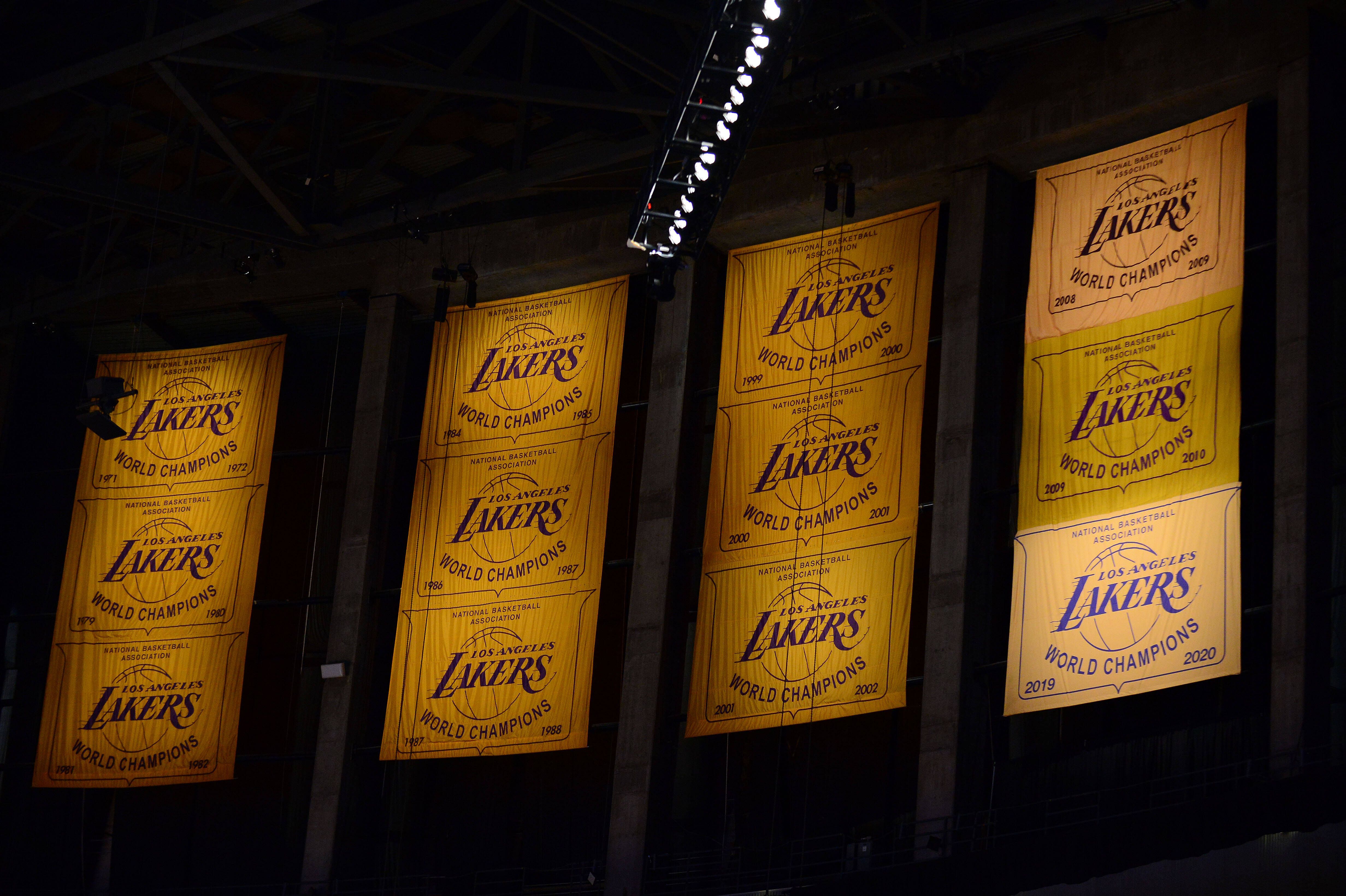 NBA, Basketball Herren, USA Houston Rockets at Los Angeles Lakers, May 12, 2021; Los Angeles, California, USA; The Los Angeles Lakers champion banners on display during the first half at Staples Ce...