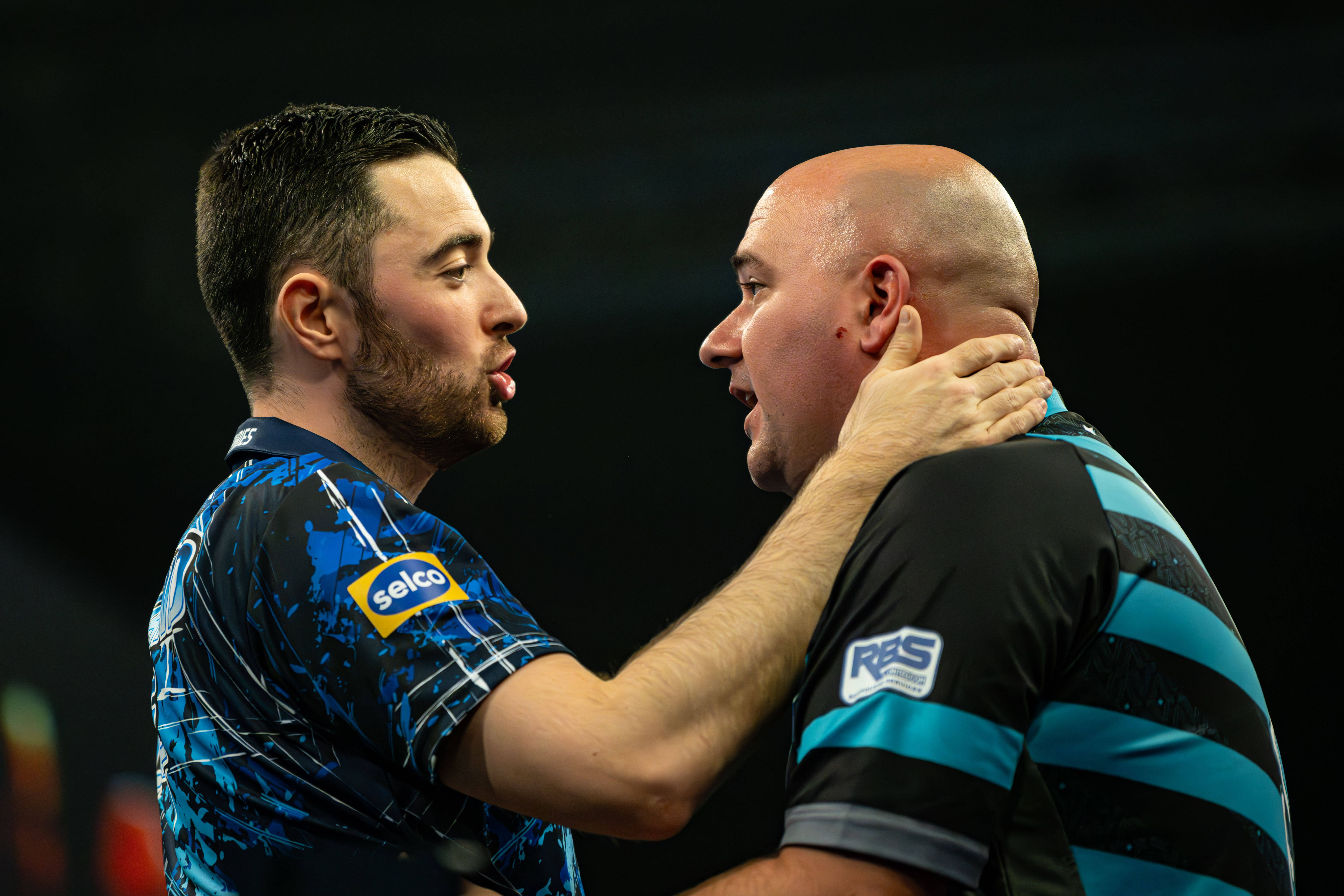 RECORD DATE NOT STATED 19th November 2023, WV Active, Aldersley, Wolverhampton, England; 2023 PDC Grand Slam of Darts, Final; Rob Cross congratulates Luke Humphries on winning the Mr Vegas Grand Sl...