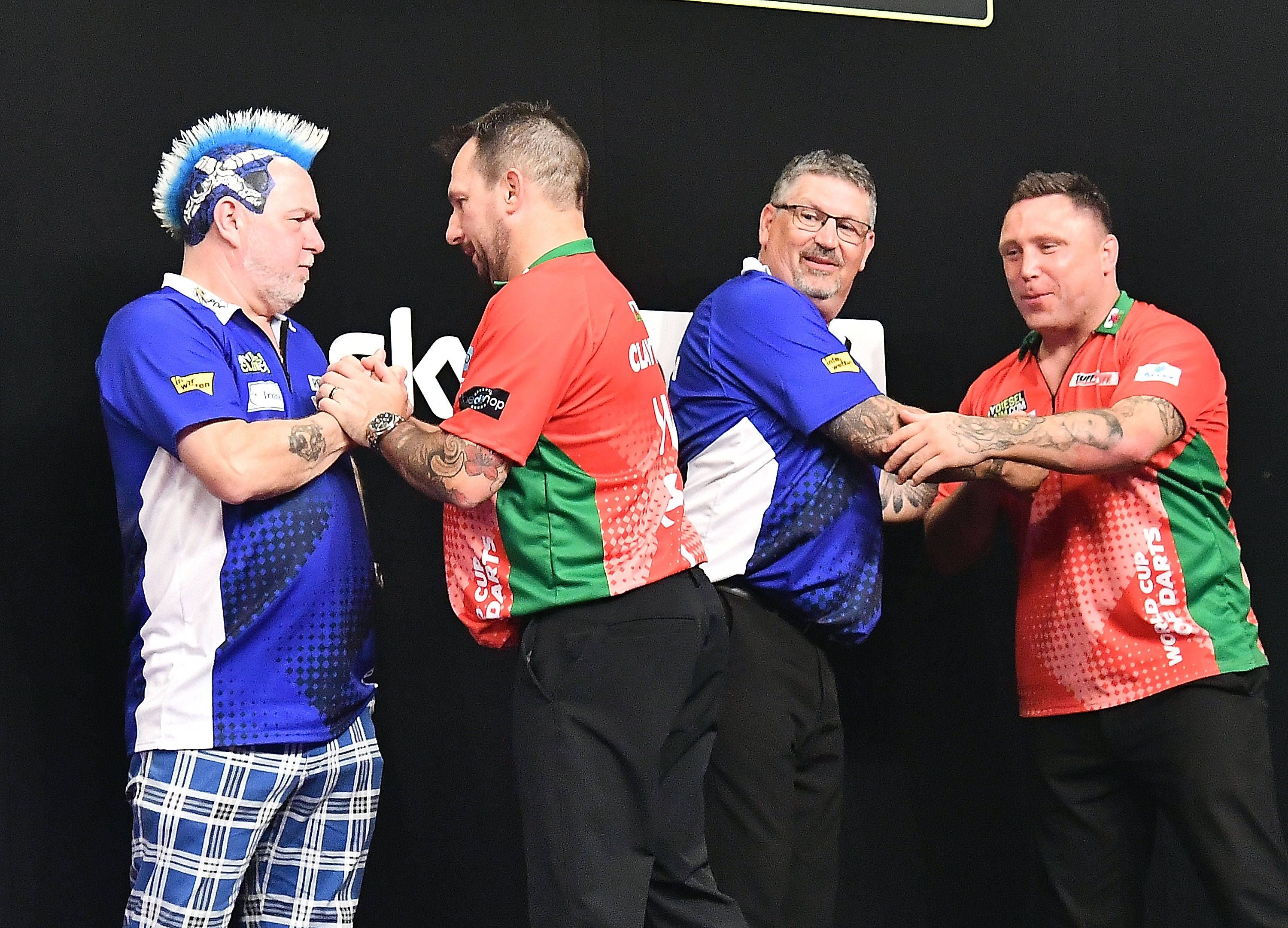 18.06.2023, xhbx, Dart World Cup of Darts, emspor, v.l. Peter Wright (Schottland), Jonny Clayton (Wales), Gary Anderson (Schottland), Gerwyn Price (Wales) (DFL DFB REGULATIONS PROHIBIT ANY USE OF P...