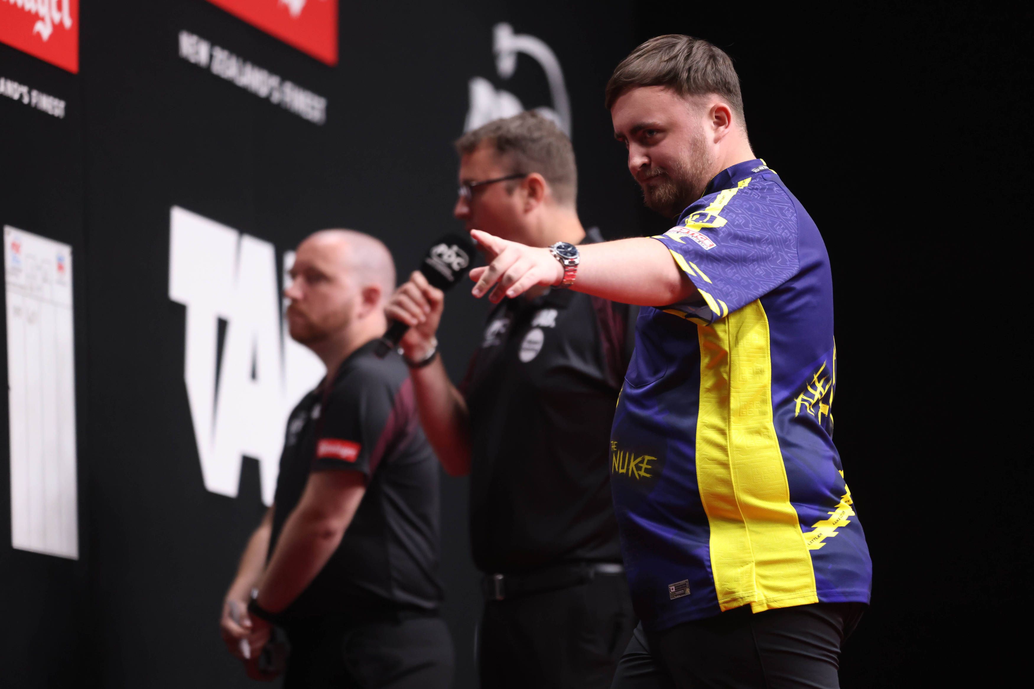 RECORD DATE NOT STATED 17th August 2024: Hamilton,, New Zealand: Luke Littler. Luke Littler versus Dimitri Van den Bergh quarter final PDC World Series of Darts - New Zealand Darts Masters at Globo...