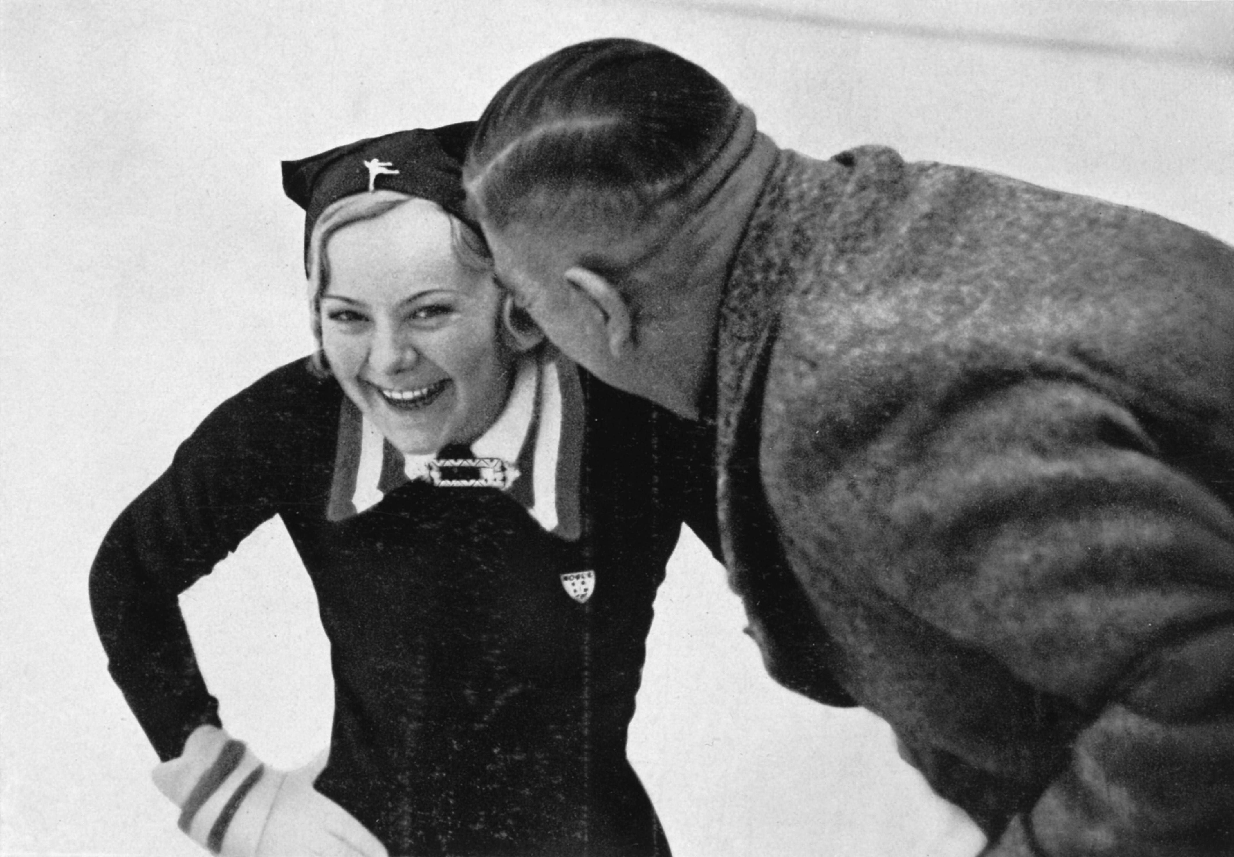 Eiskunstlauf, Olympiasiegerin Sonja Heine, Norwegen, lachend, deutscher Veteran Arthur Viereck hat sicher wieder einen guten Witz gemacht, Goldmedaillengewinner, Europa *** Figure skating, Olympic ...