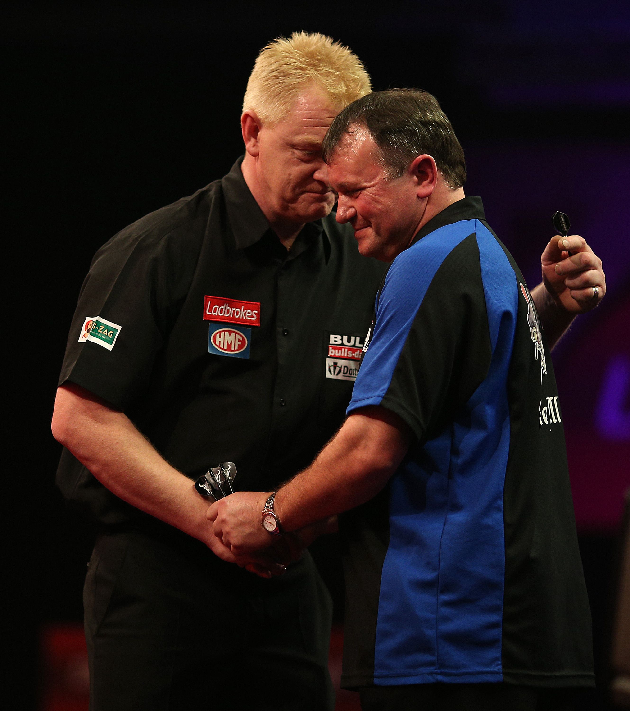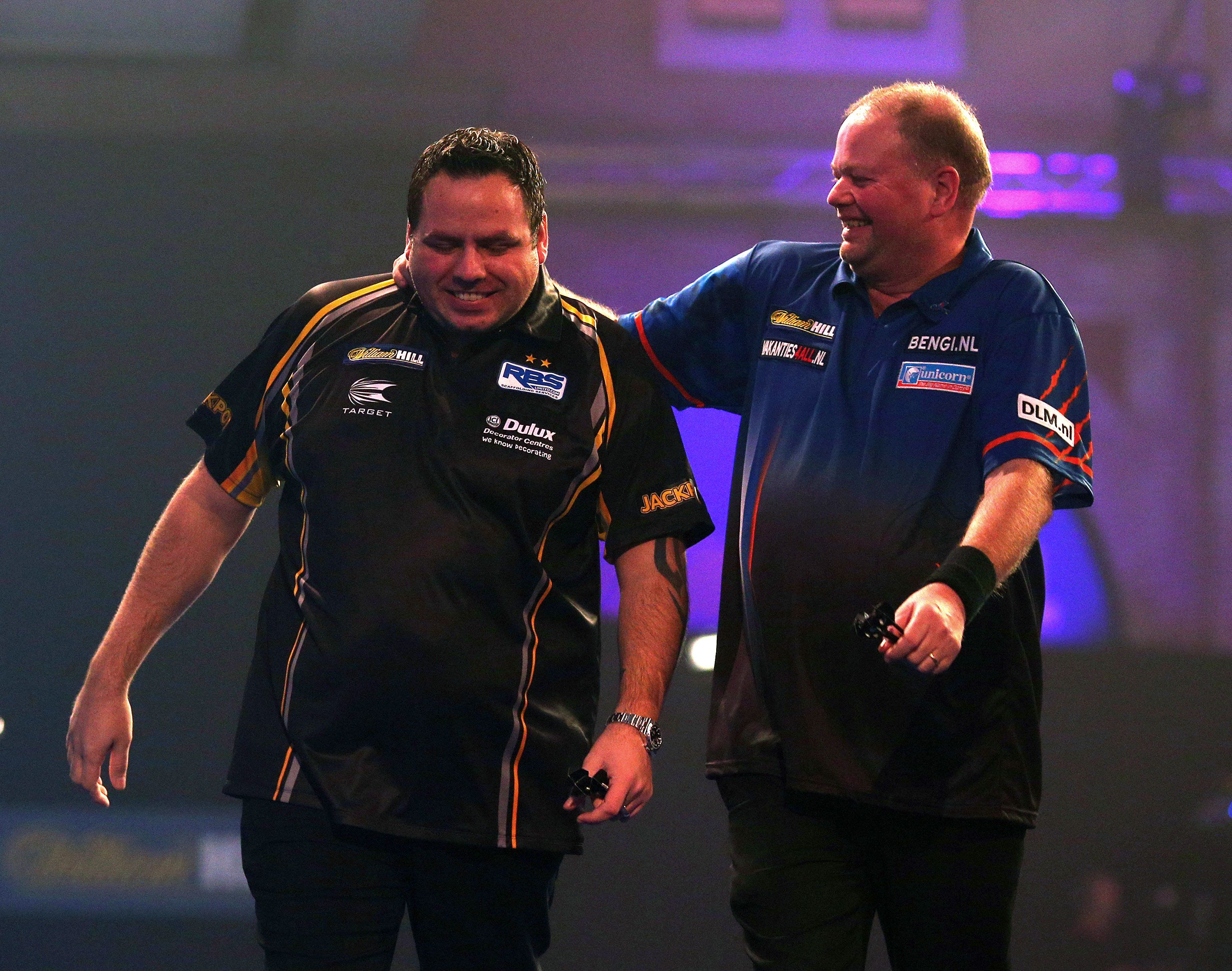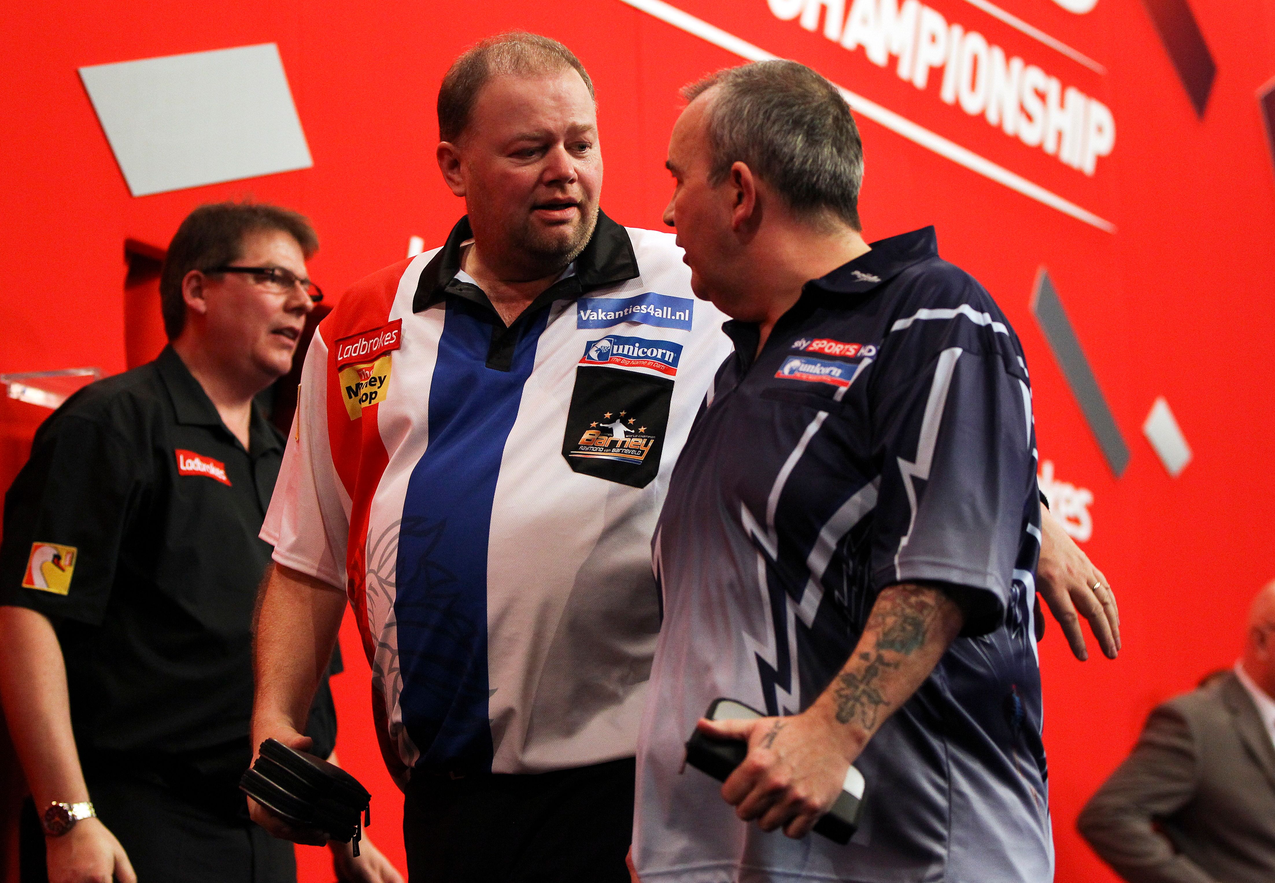 Nach dem Halbfinale der beiden Legenden - Taylor siegte mit 6:4 - zog "Barney" den Engländer beim Handshake an sich heran, um ihn zu umarmen. "The Power" missverstand dies, stieß den Niederländer weg und beleidigte ihn. Später entschuldigte er sich dafür.2012 Getty Images