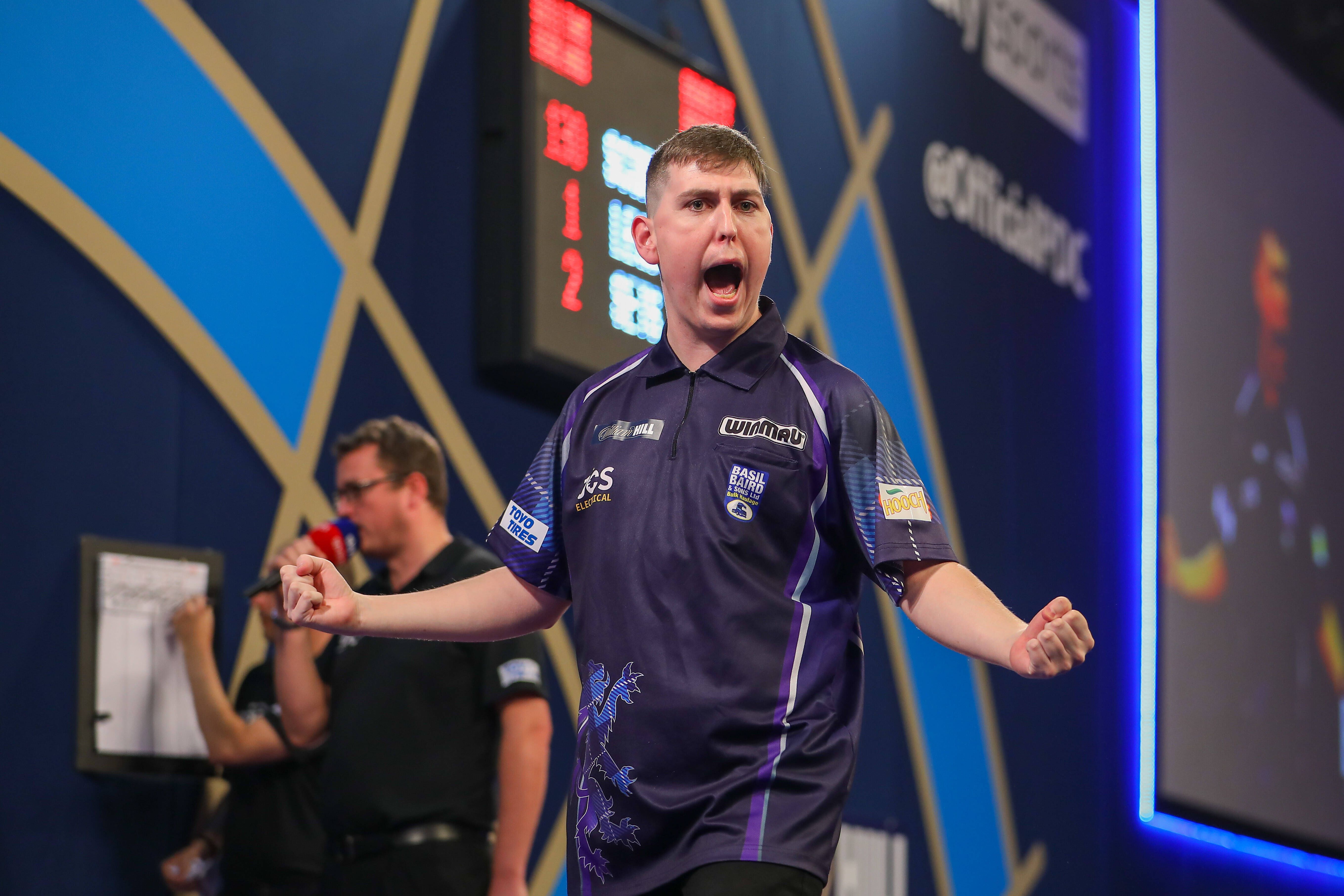 17th December 2021; Alexandra Palace, London, England: The William Hill World Darts Tournament; William Borland celebrates winning a leg against Bradley Brooks in the final set. PUBLICATIONxNOTxINx...
