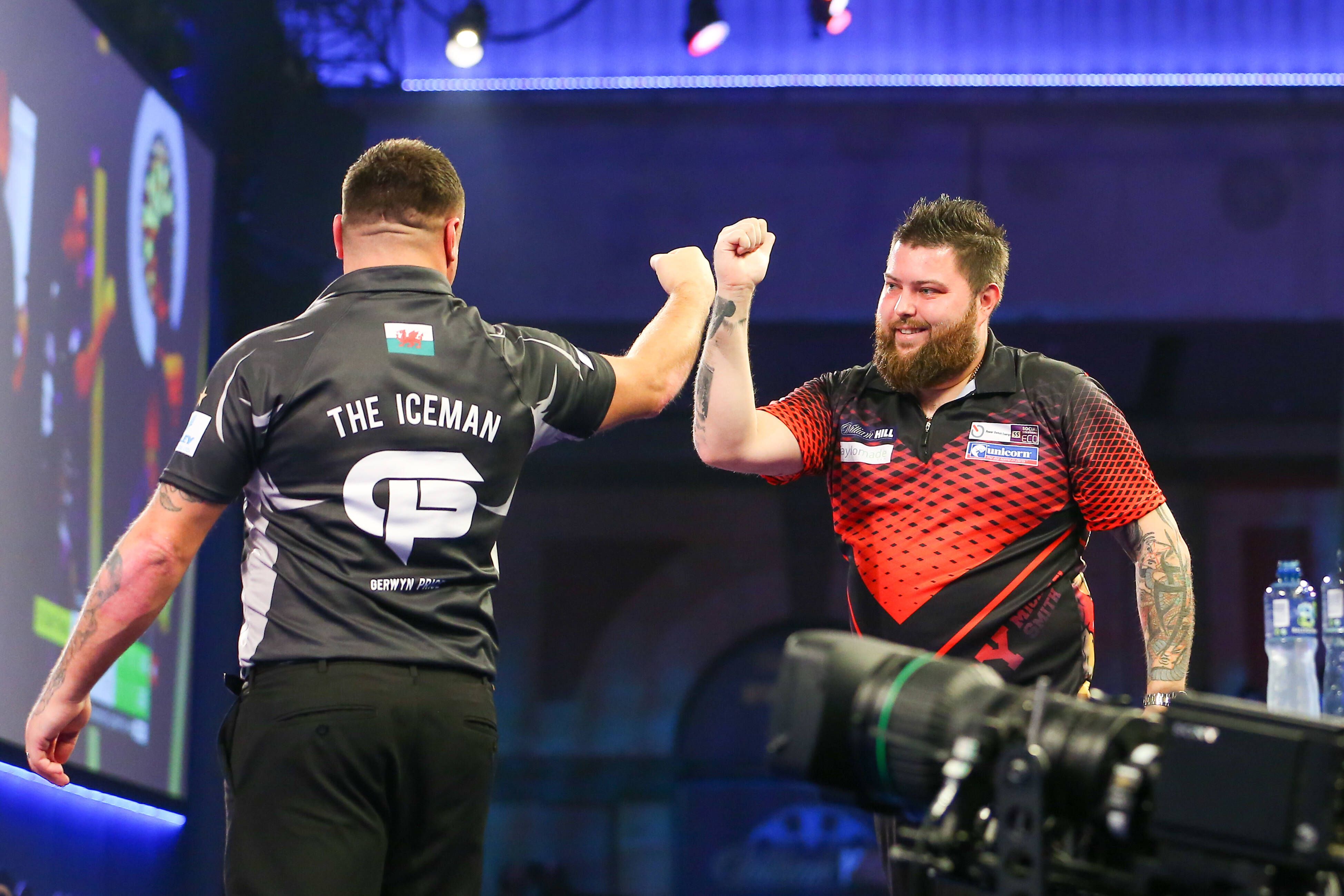 1st January 2022: Alexandra Palace, London, England: The William Hill World Darts Tournament, quarter finals; Gerwyn Price and Michael Smith fist bump each other after Gerwyn Price 9-darter in the ...