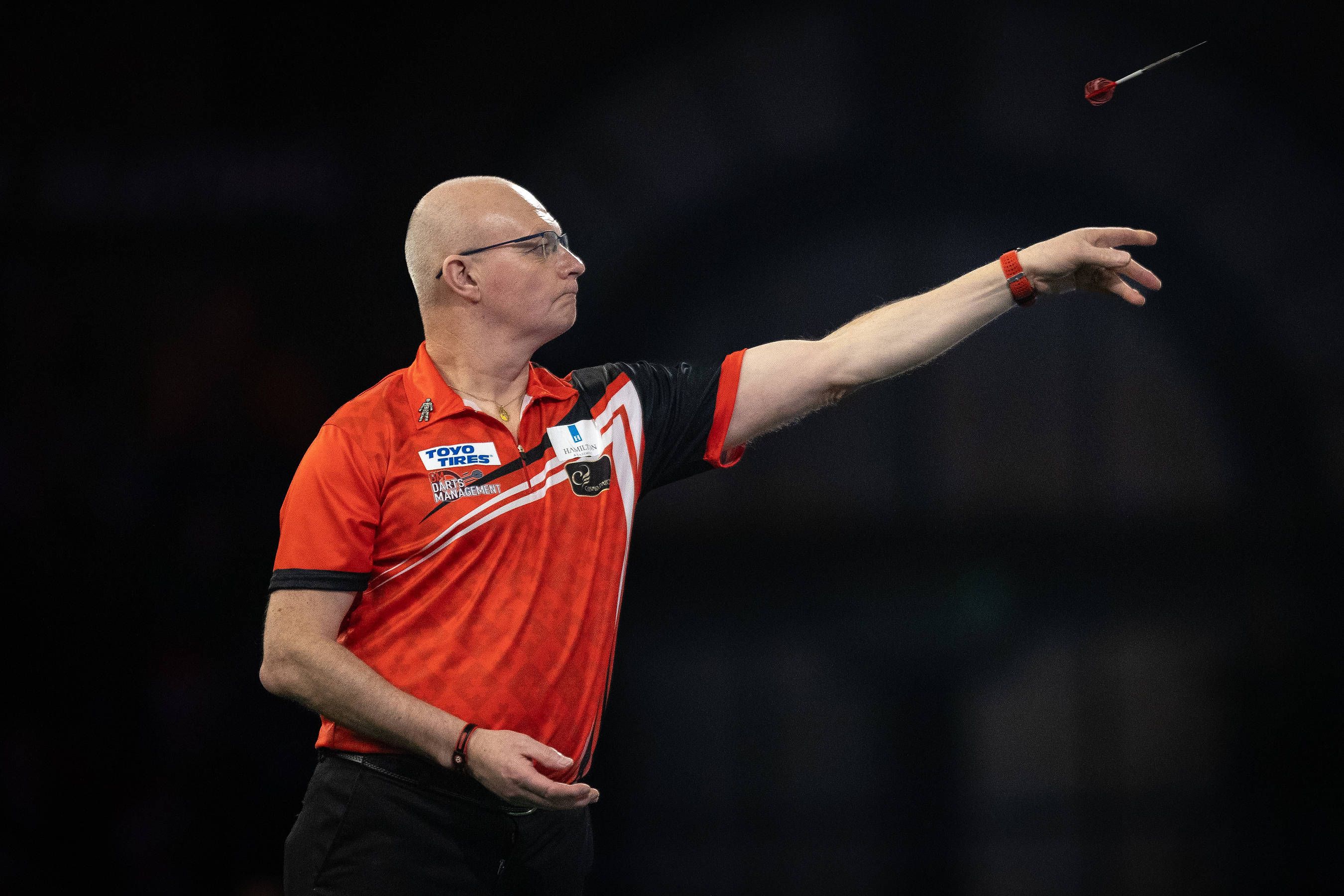 Darts Paddy Power 2024 PDC World Darts Championship Mickey Mansell (NIR) in his R2 match against Brendan Dolan (NIR) (not in picture) during the 2024 PDC World Darts Championship at Alexandra Palac...