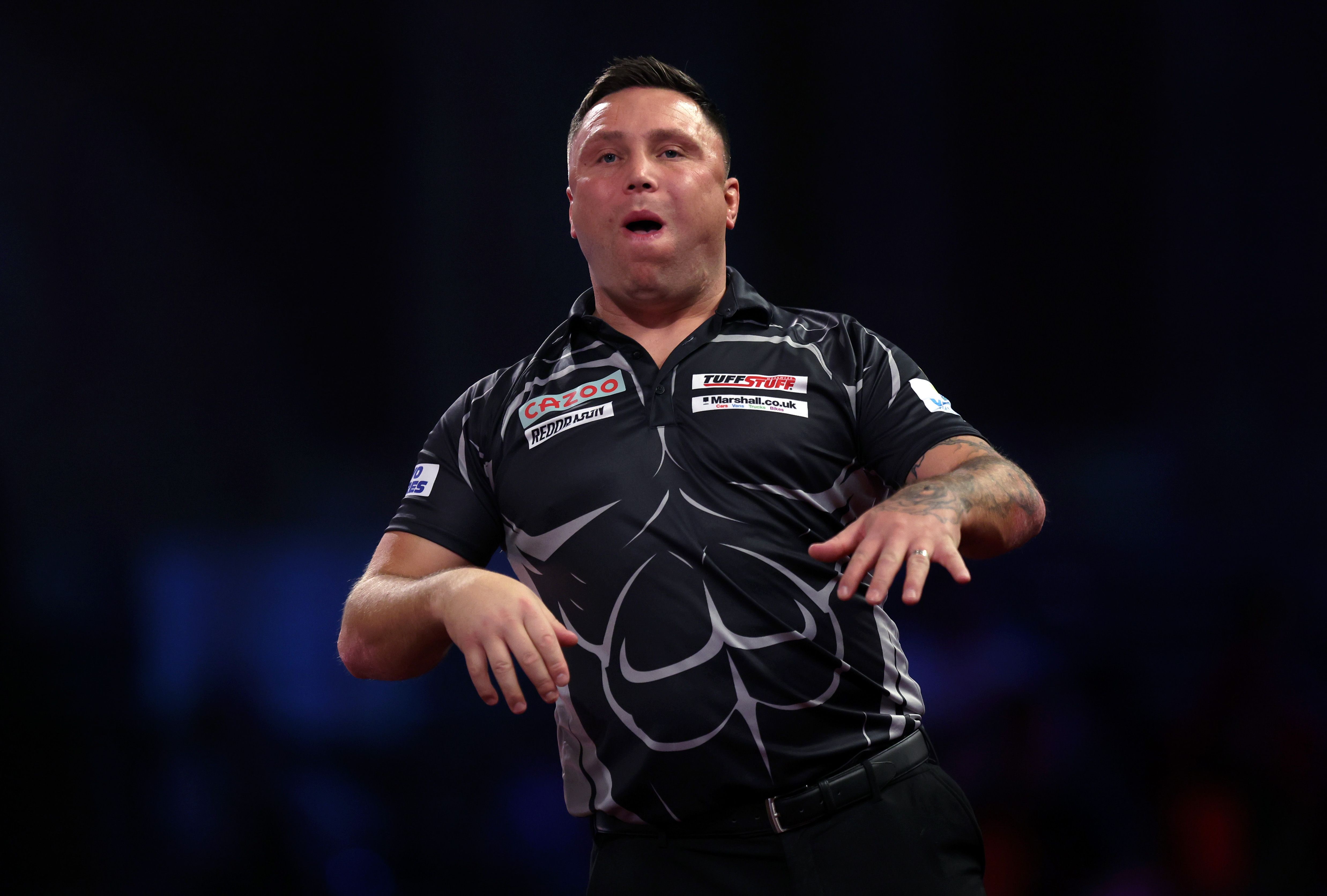 Nach einer verpassten Triple-20 für eine 180er-Aufnahme streckte Price beide Hände nach vorne und schob die Zunge gegen die Unterlippe. Darts-Fans eskalierten auf Social Media, warfen ihm Verunglimpfung von Behinderten vor. Die PDC erinnerte den Waliser, der Jose de Sousa im Achtelfinale mit 4:1 bezwang, in der Folge an die Einhaltung der Standards und gab in seinem Namen eine Entschuldigung heraus.2022 Getty Images