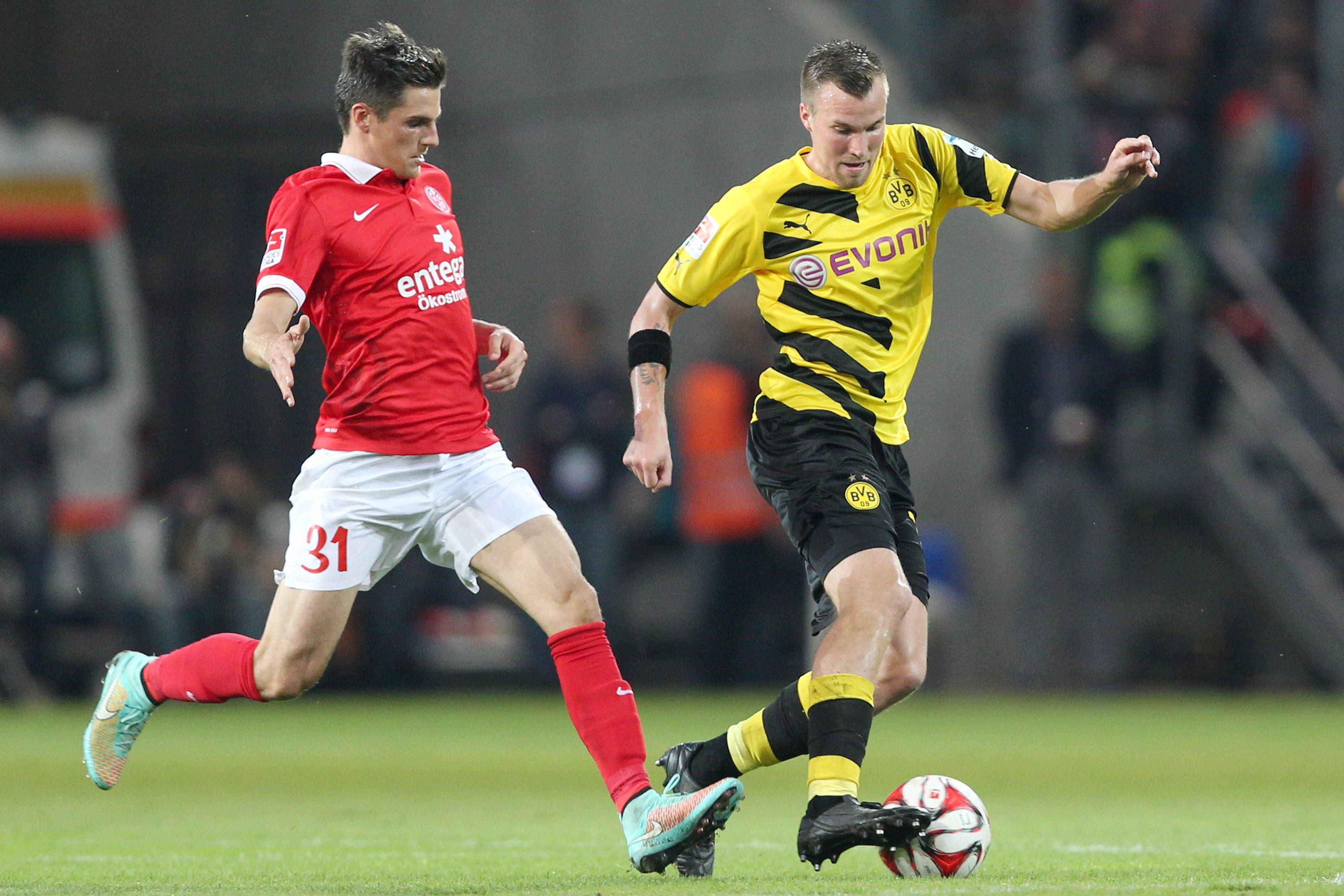 Jonas HOFMANN (MZ) li. gegen Kevin GROSSKREUTZ (GROßKREUTZ) (DO) re. Fussball 1. Bundesliga, 4. Spieltag, 1. FSV Mainz 05 (MZ) - Borussia Dortmund (DO) 2:0 am 20.09.2014 in Mainz Deutschland.