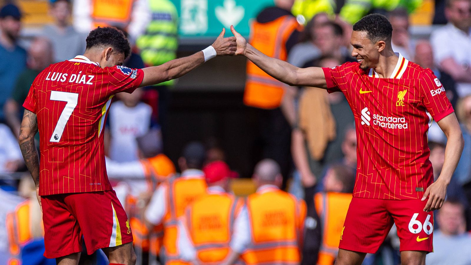Bevor die Feierlichkeiten mit dem Schlusspfiff offiziell losgehen konnten, fertige Liverpool um die Stars Luis Diaz (li.) und Trent Alexander-Arnold (re.) die Tottenham Hotspur mit 5:1 ab.IMAGO/Propaganda Photo